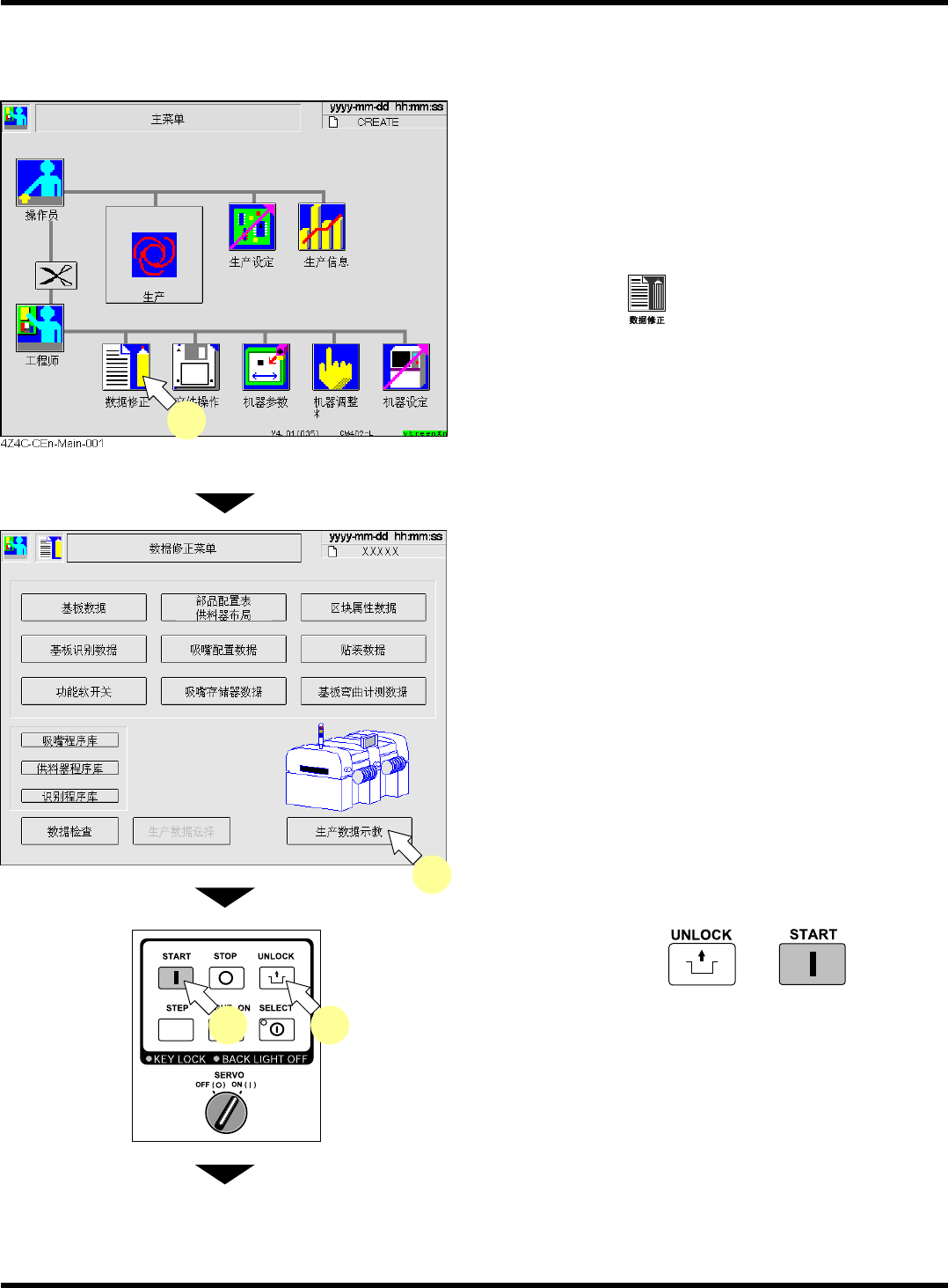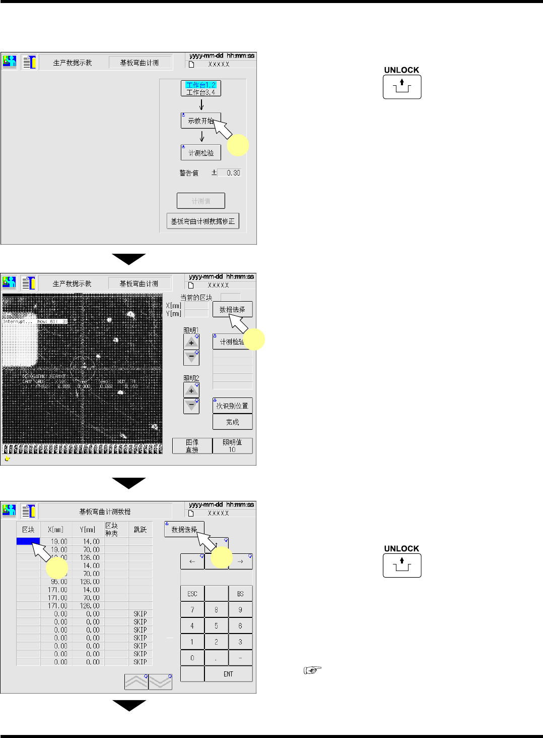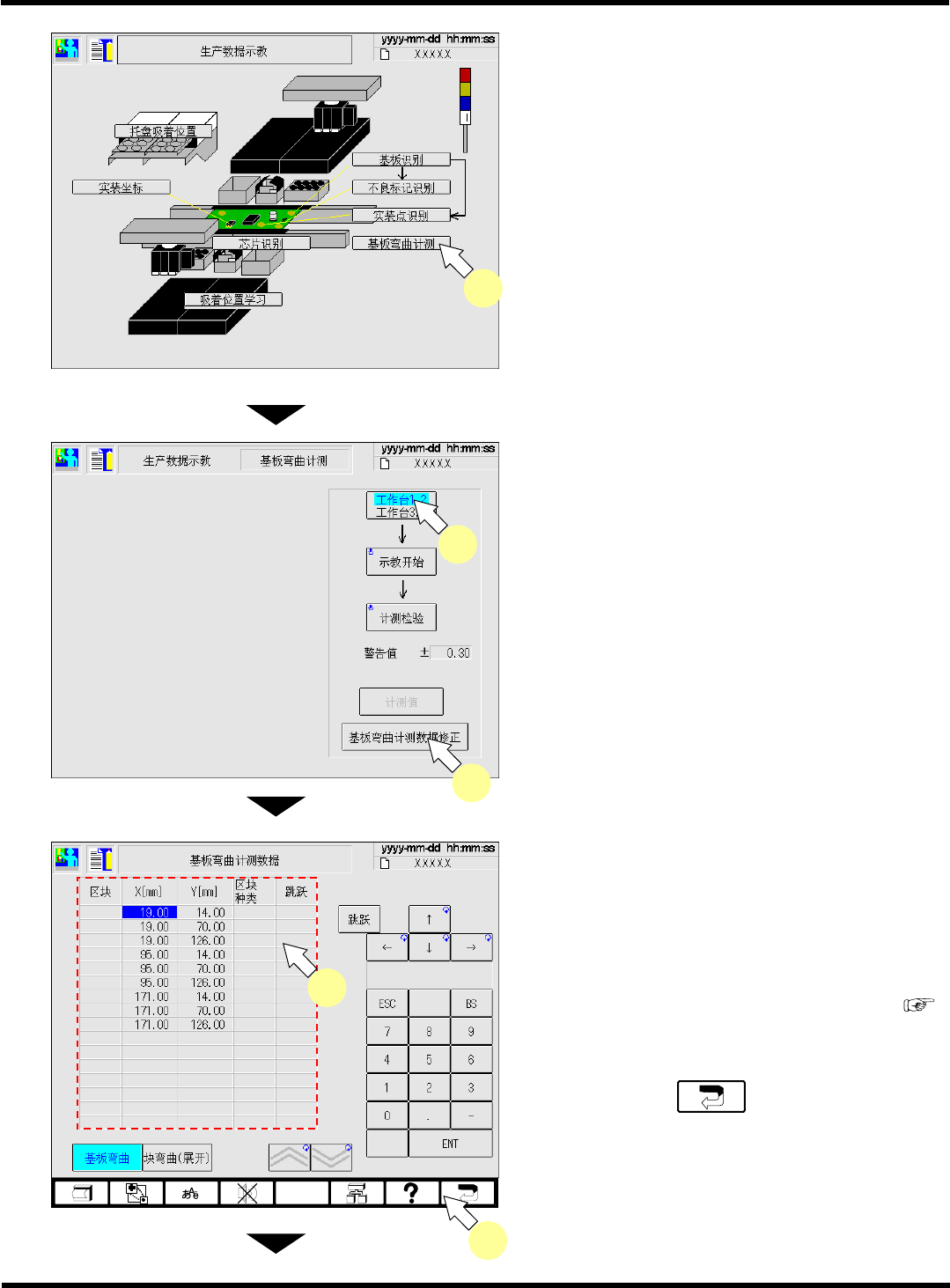 CM602-L 操作手册 4.7 基板弯曲计测示教 (12 吸嘴用、 8 吸嘴用选购件 ) Pa ge 4- 45 5. 按 [ 基板弯曲计测 ] 。 • < 基板弯曲计测 > 画面将被显示。 6. 选择工作台 1,2 。 ( 高度计测传感器位于工作 台 1 上时 ) 7. 按 [ 基板弯曲计测数据修正 ] 。 • < 基板弯曲计测数据 > 画面将被显示。 8. 确认在基板弯曲计测点数据的坐标中是否 设定好适当的…