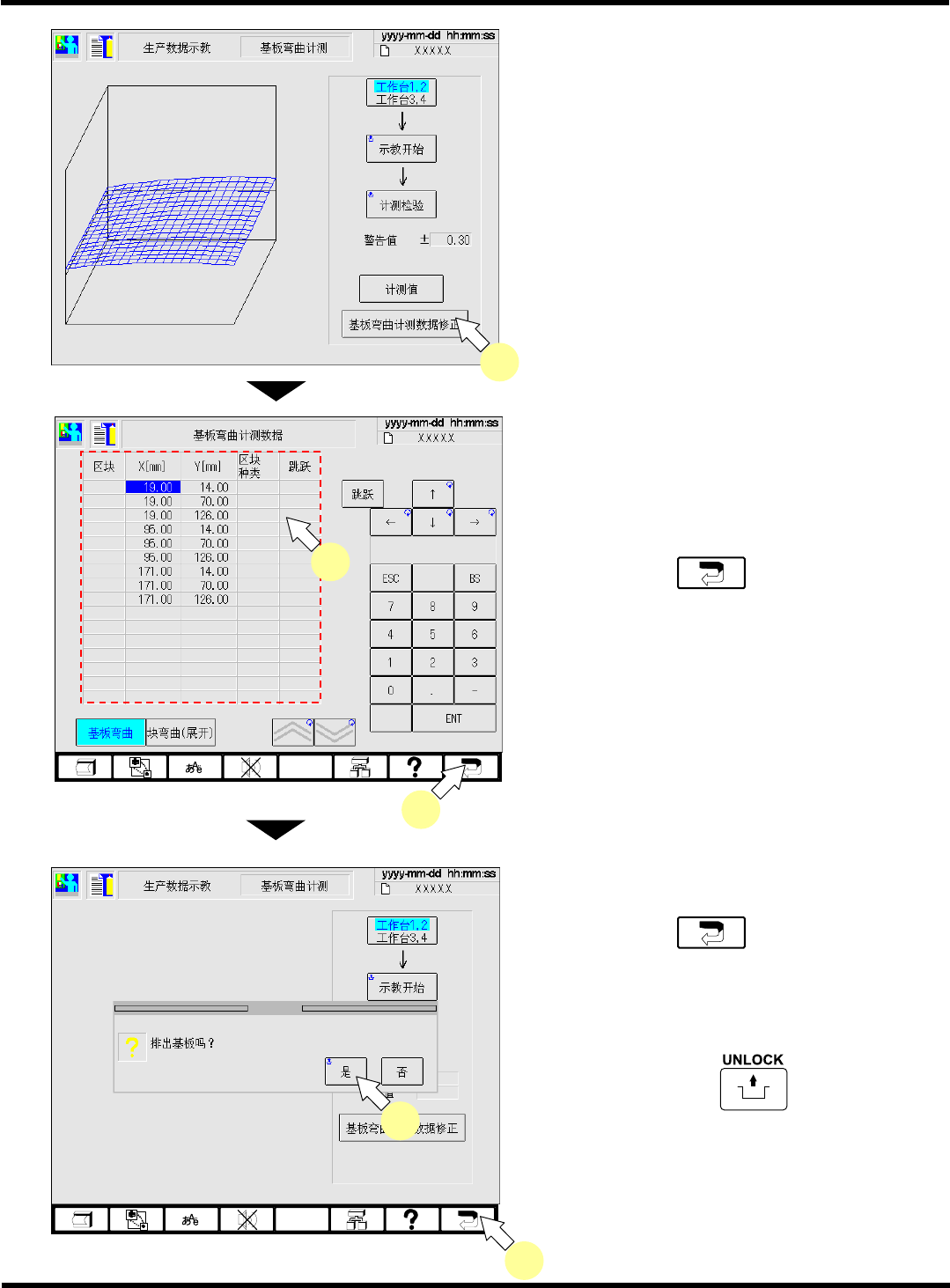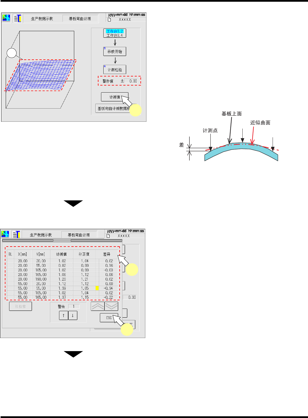 CM602-L 操作手册 4.7 基板弯曲计测示教 (12 吸嘴用、 8 吸嘴用选购件 ) Pa ge 4- 49 22. 按 [ 基板弯曲计测数据修正 ] 。 23. 调整基板弯曲坐标、计测点数。 ∗ 请将曲面补正精度和计 测时间调整到最佳化。 用 [ 跳跃 ] ,最多 25 个点最少可减少到 9 个点。 24. 按功能键的 。 • 基板弯曲坐标将被保存 。 • 存储在机器中的数据将 会自动反映到 PT 上。 25. 为了再次确认补正…