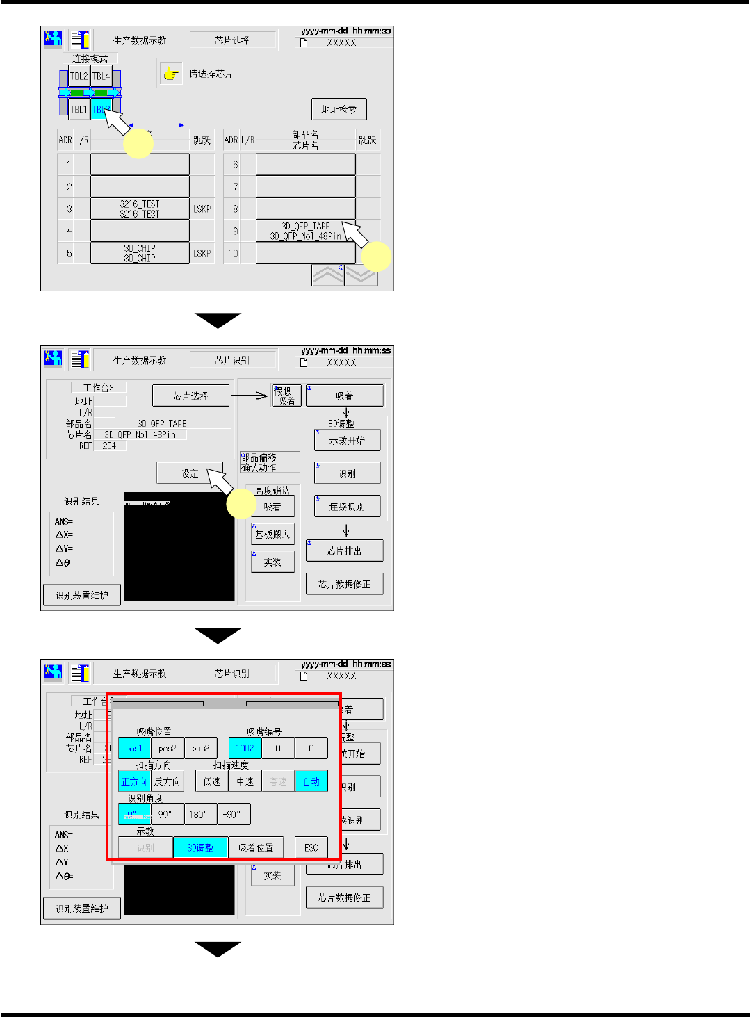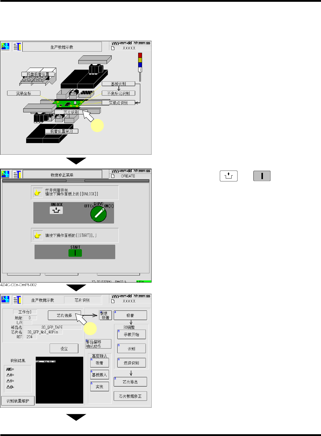 CM602-L 操作手册 4.8 通过 3D 传感器 ( 选购件 ) 进行的芯片识别示教 Pa ge 4- 58 4.8.4 通过 3D 传感器进行的芯片识别示教步骤 通过芯片识别示教进行 部品识别的测试。 1. 按 [ 芯片识别 ] 。 • 将会变为 < 芯片识别 > 画面。 2. 按操作面板的 UNLOCK → ST AR T 。 3. 按 [ 芯片选择 ] 。 • 将会变为 < 芯片选择 > 画面。 下一页…