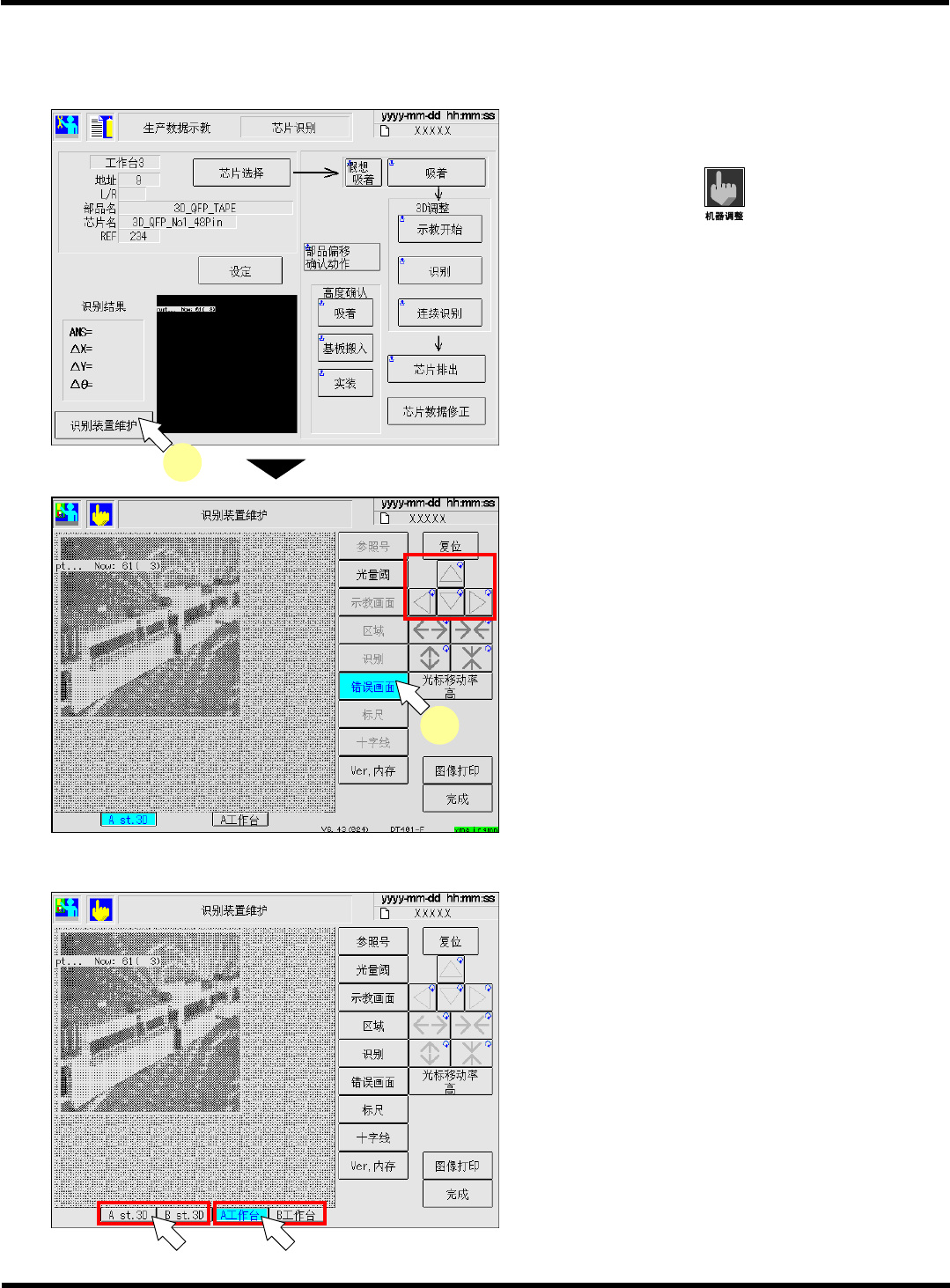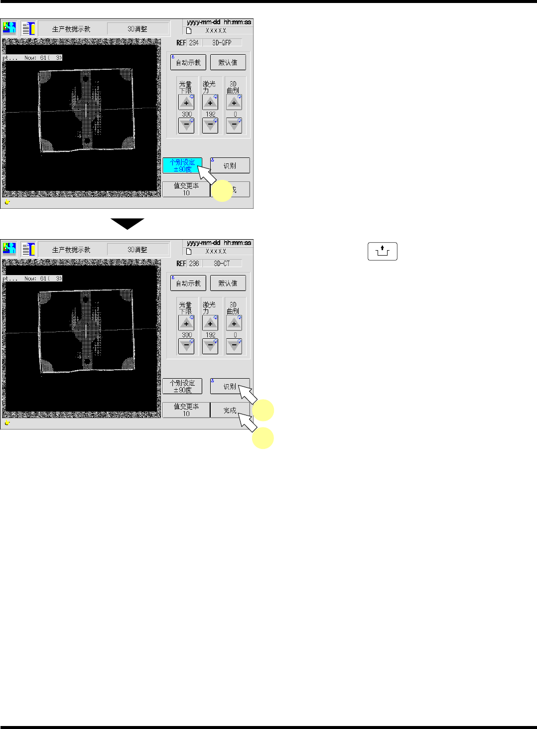 CM602-L 操作手册 4.8 通过 3D 传感器 ( 选购件 ) 进行的芯片识别示教 Pa ge 4- 62 4. 按 [ 个别设定 ± 90 度 ] 。 • 当识别角度为 + 90 ° 和 − 90 ° 时, [ 个别设定 ± 90 度 ] 就处于 ON ( 蓝色 ) 状态,显示识别角 度 ± 90 ° 的 ‘ 光量下限 ’ 、 ‘ 激光力 ’ 的数值,并成为 可变更設 定的状态。 ∗ 在上述的状态时,请进 行步骤 2. 、 3.…