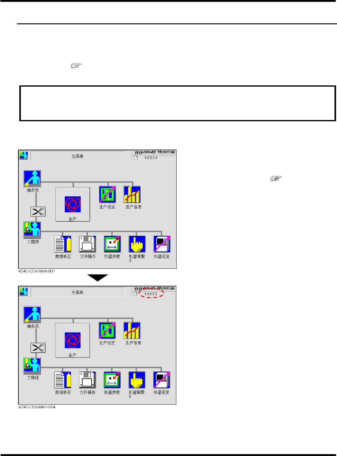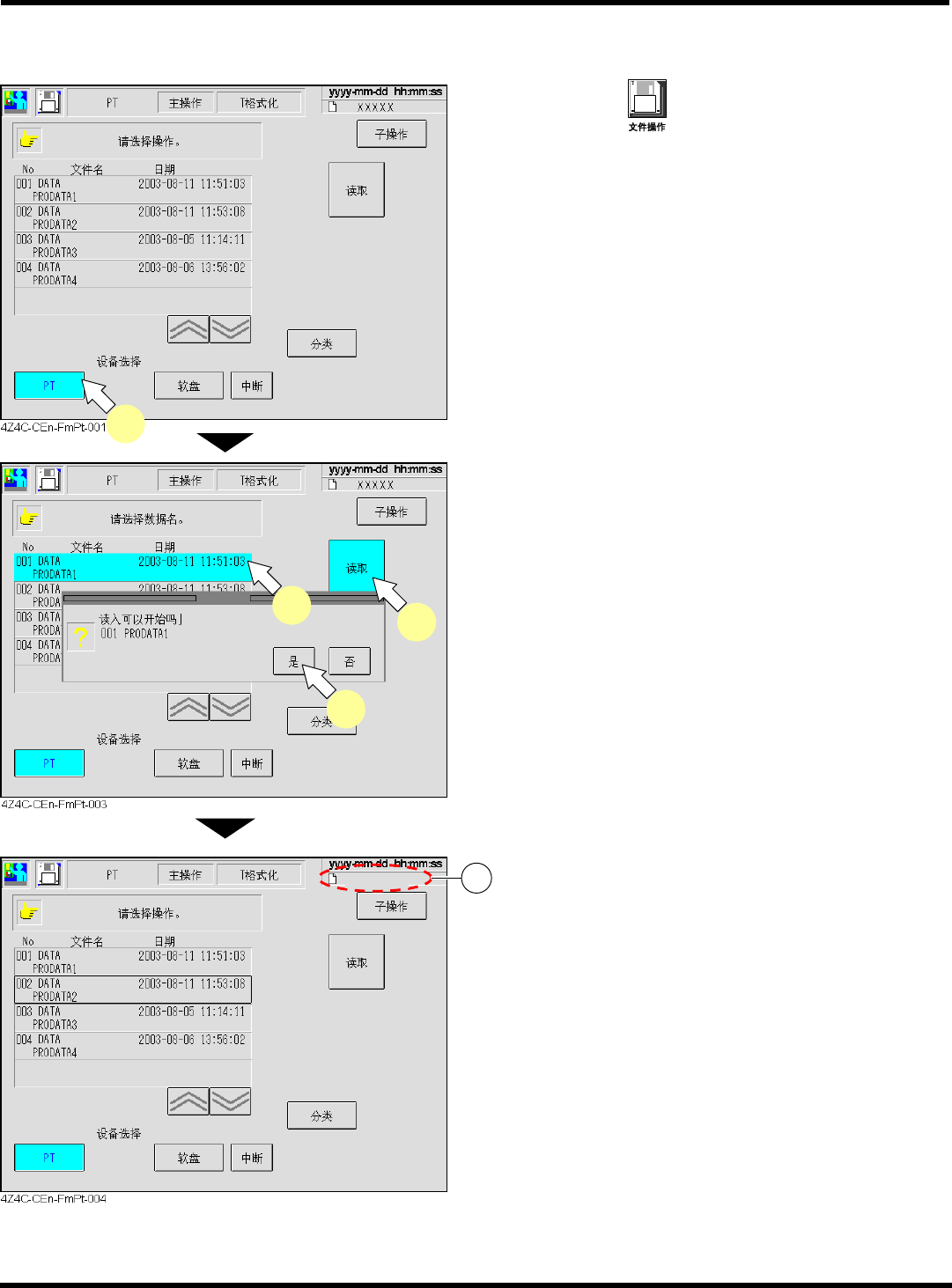 CM602-L 操作手册 5.2 生产数据的变更 Page 5-4 B) 在文件操作中读取 1. 按主菜单的 。 • 文件操作的画面将被显 示。 2. 按 [PT] 。 • 将设备对象切换为 PT 。 • 显示出用 PT 所登录的数据列表。 3. 选择读取的数据名。 • 反转显示所选择的数据 名。 • 按 [ 分类 ] ,数据就会按日期 先后的顺序进行排 列。 4. 按 [ 读取 ] 。 5. 按 [ 是 ] 。 • 显示 “ 数据读取…
