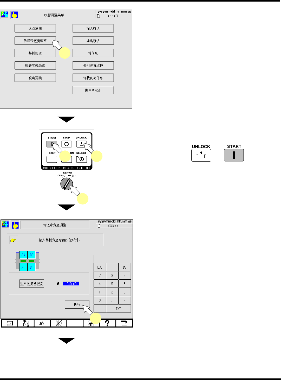 CM602-L 操作手册 5.3 搬送导轨宽度的调 整 Page 5-6 2. 按 [ 传送带宽度调整 ] 。 3. 将伺服开关置于 ON ( I ) 。 4. 按操作面板的 → 。 • 因到此之前的操作履历 ( 因已处于原点复归 状 态 ) ,而不必进行原点复归 动作。此时,不需要 此步骤。 • 传送带宽度的调整画面 将被显示。 5. 按操作面板的 [ 执行 ] 。 下一页 EJM4A -Ma-Menu-0001 2 3 4 4 EJ…