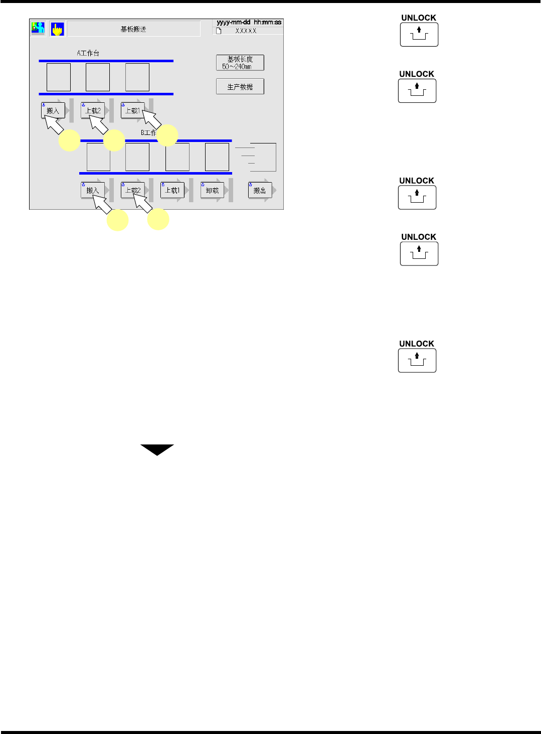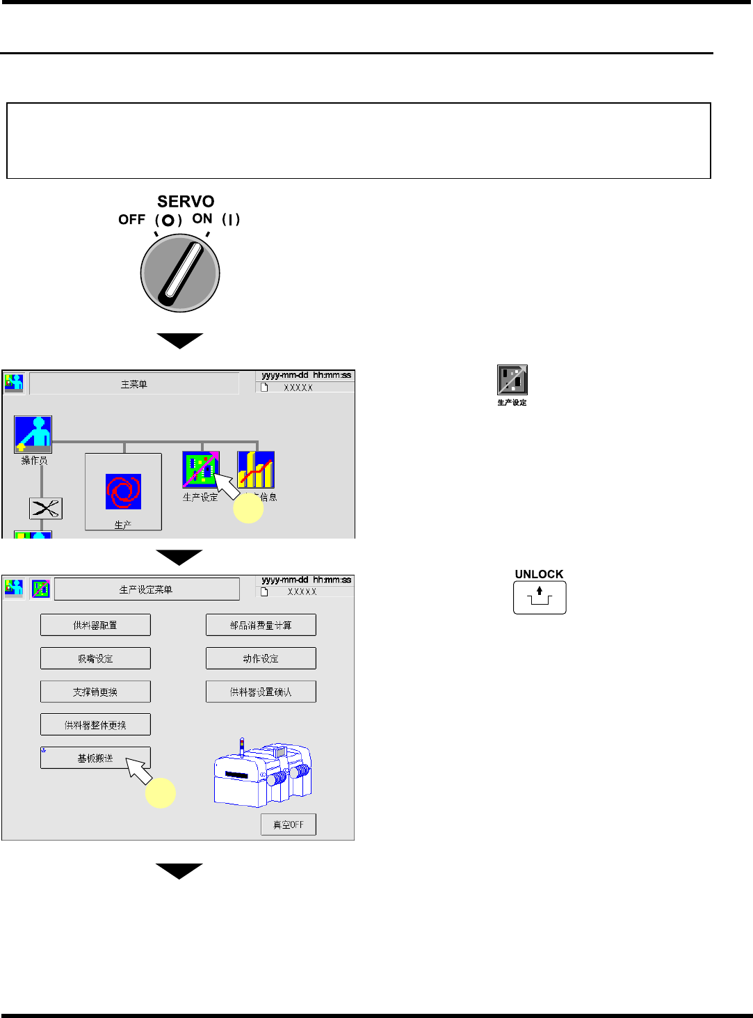 CM602-L 操作手册 5.7 基板搬送测试 Pa ge 5- 20 5.7 基板搬送测试 搬送导轨宽度、 支 撑销的调整一结束, 即进行基板搬送 测试, 在基板搬送 过程中请确认无卡住现象 。 通知 实际操作中要进行整个生产线的搬送测试。在本节对前工序的搬送测试结束后,前工 序的后传送带上有基板的情况进行了说明。 1. 将伺服开关置于 ON ( I ) 。 2. 按主菜单的 。 • 生产设定菜单的画面将 被显示。 3. 按操作面板的…
