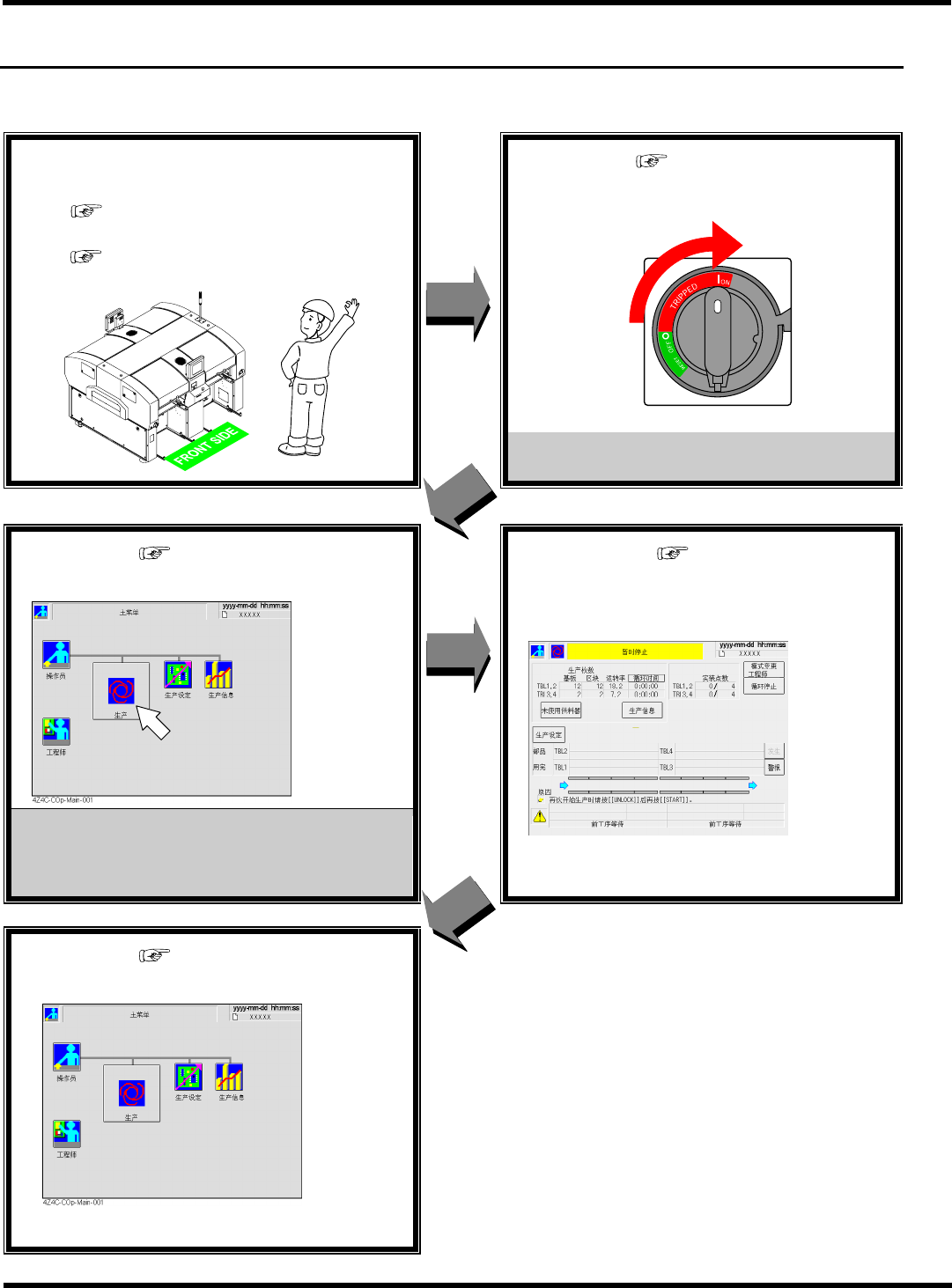 CM602-L 操作手册 2.1 生产作业的流程 Page 2-2 2. 2.1 生产作业的流程 对生产中操作员所进行 的作业流程进行了说明。 ( ∗ 记号的操作是由工程师进 行的作业。 ) 2. 机器启动 ( “2.3.1 本机的启动 ”) • 接通电源,启动本机。 1. 准备 • 开始作业前的检查 ( “2.2.1 生产开始前的检 查 ”) • 生产材料的设置 ( “3. 生产材料的设置 ”) 准备 OK EJM4A-A A01 ∗…