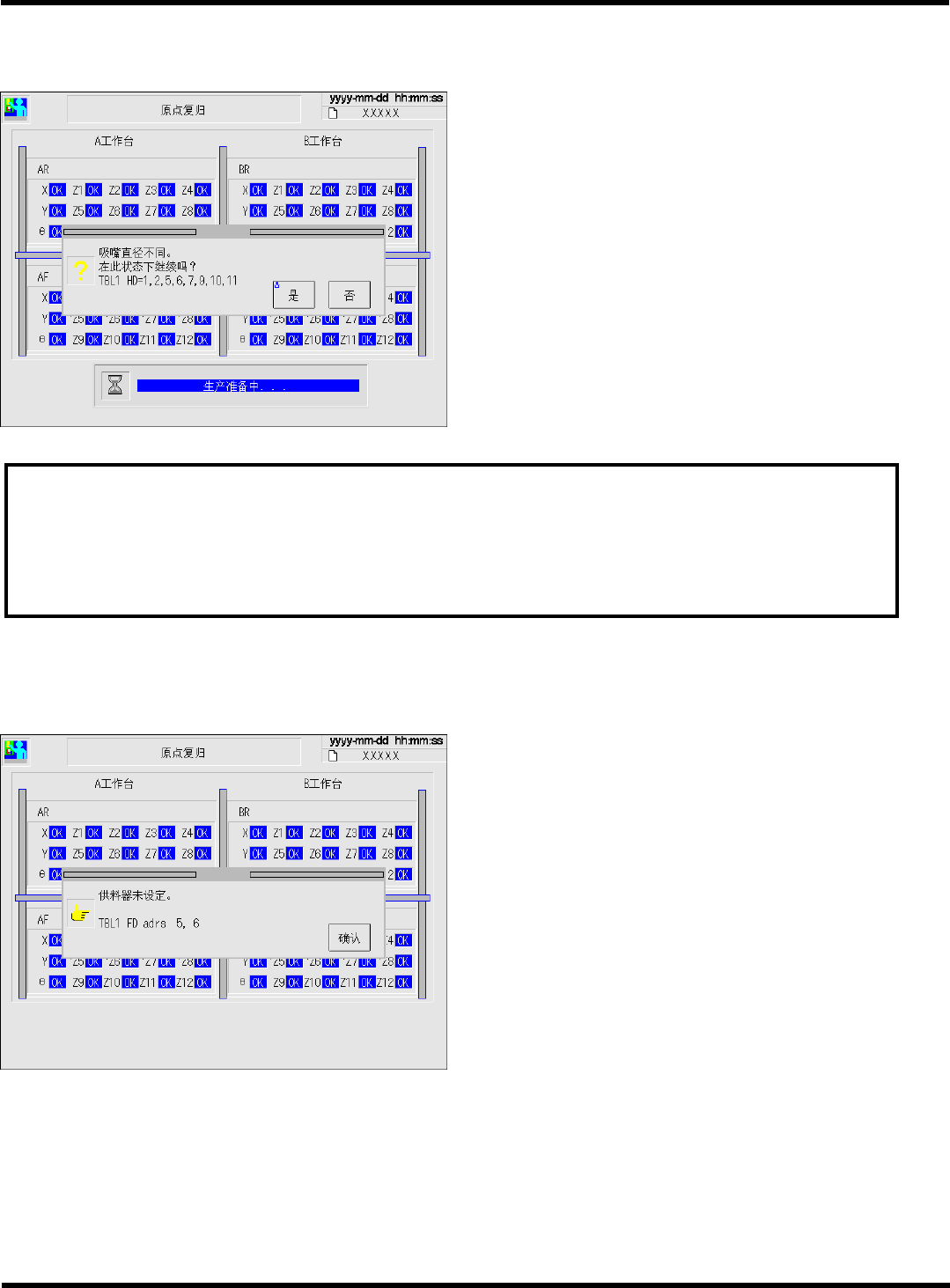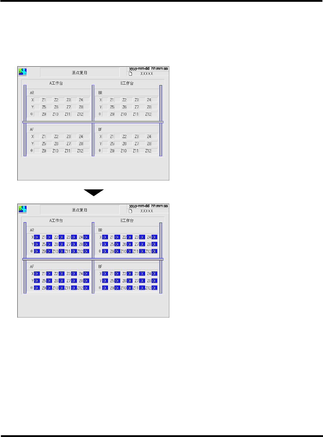 CM602-L 操作手册 2.3 生产开始 Page 2-9 2.3.4 原点复归 在此在开始实装前,将 自动进行使各轴返回至原点 位置的动作。 进行所有轴的原点 复归。 ∗ 画面为高速吸头 (12 吸嘴 ) 。 • 正常结束原点复归的轴 将显示 “OK” 。 EJM8A- C-OMC02-A01- 00 EJM4A -Ro-0002 EJM4A -Ro-0001