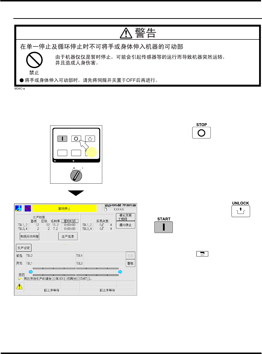 再次开始生产时,按操作面的