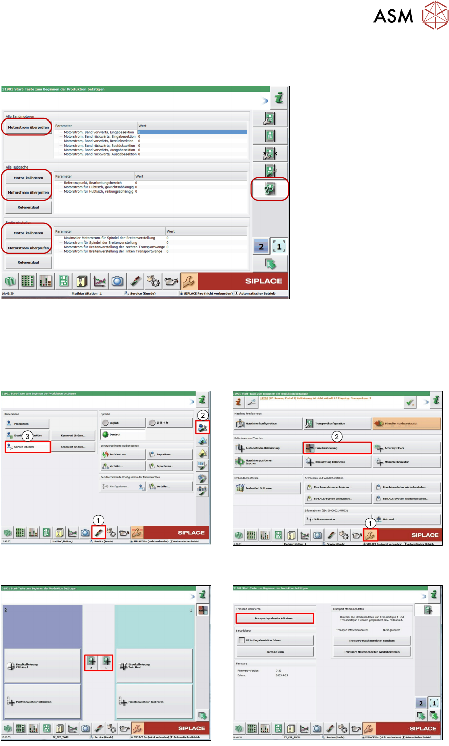 6 Transportsystem 6.6 Teileaustausch / Einstellungen / Kalibrierung Technisches Training FSE SIPLACE TX-Series 08/2018 85 6.6.2.2 Motor kalibrieren (Anheben) / Motorstrom prüfen (Anheben / Transport / Breite) Motor und M…