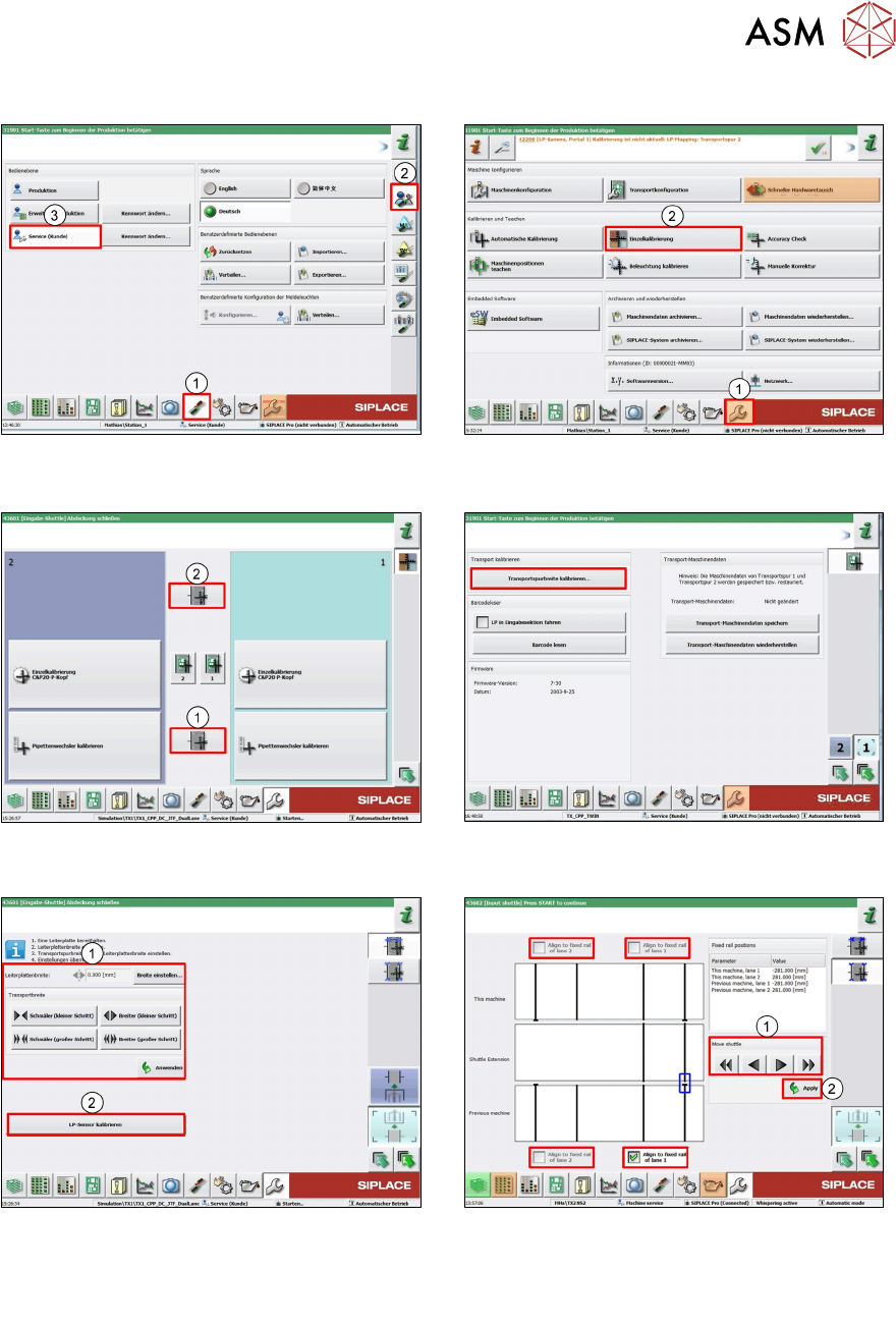 6 Transportsystem 6.6 Teileaustausch / Einstellungen / Kalibrierung 90 Technisches Training FSE SIPLACE TX-Series 08/2018 Menü TX Shuttle Einzelfunktion und Testfunktion ► Klicken Sie auf das Menü Sensoren und Funktionen…