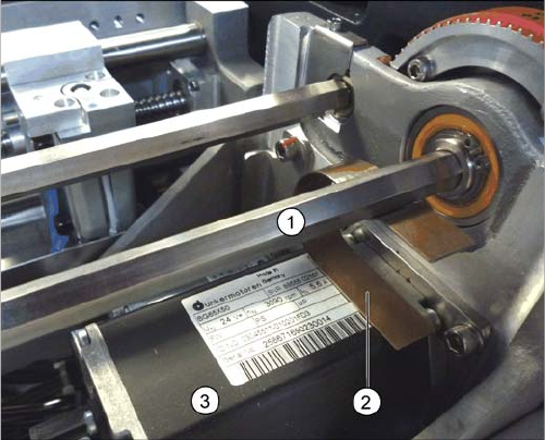 (1) Breitenverstellungsantrieb (2) Messpunkt am Breitenverstellungs-Zahn-