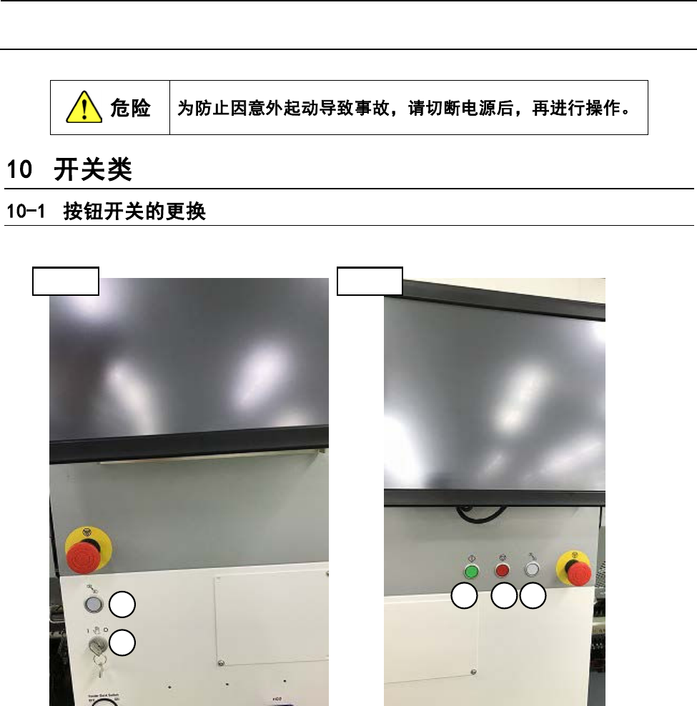 维修 调 整 要 领 书 按钮开关的交换 ① 开始开关 ② 停止开关 ③ 切换前后操作开关 ( 装有背面操作装置时 ) ④ 钥匙开关 前侧 3 1 2 3 4 后侧 10-1