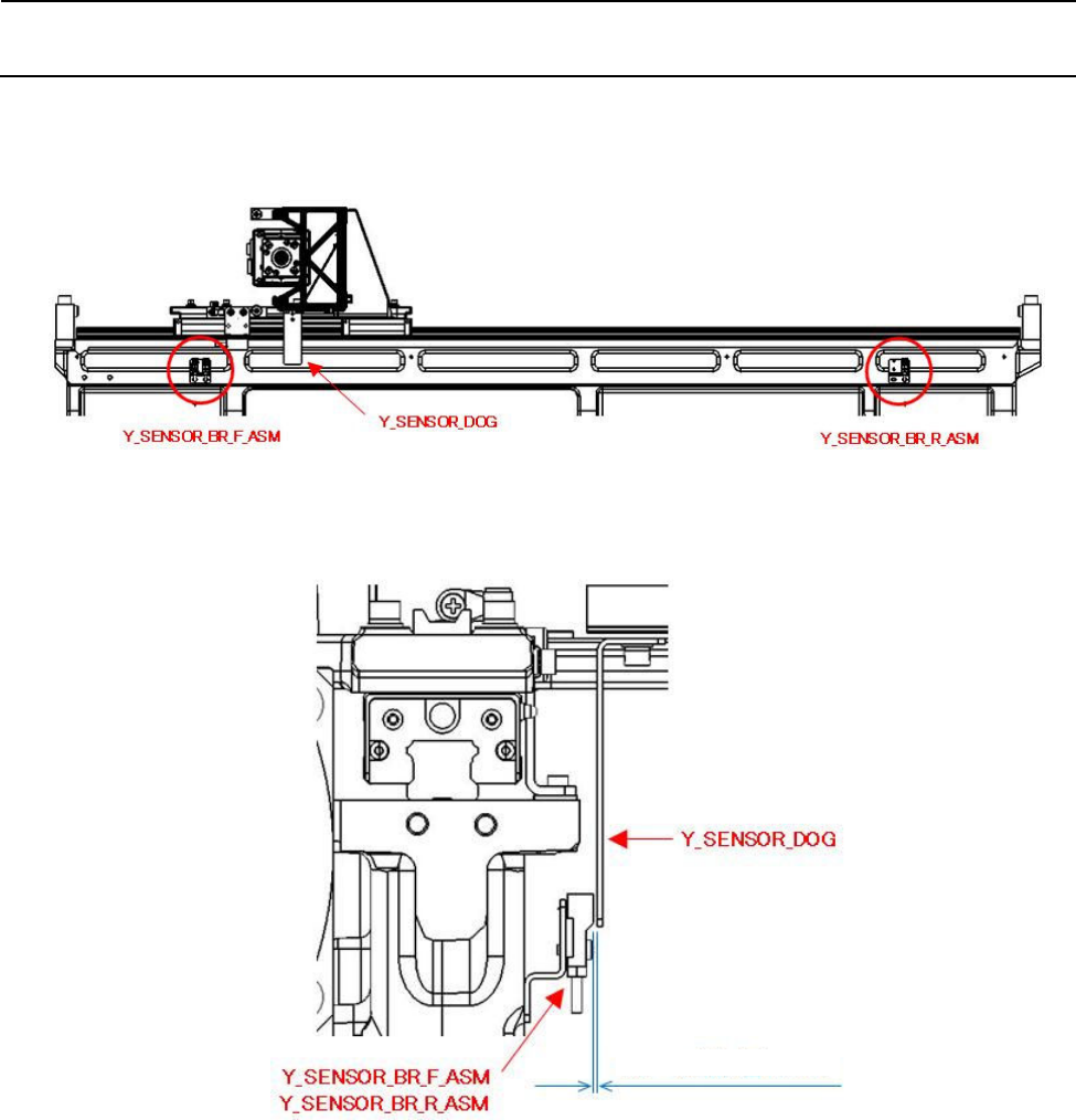 1) 松开 Y 极限传感器托架的止动螺丝进行调整,离开座架之开尾销安装中心位置的距离要成为下图