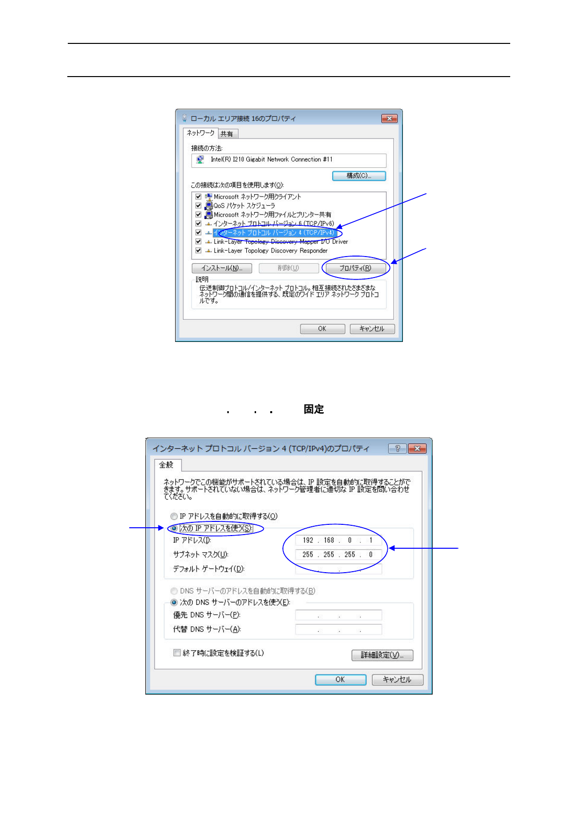 在这一画面中,请选择①“使用下面的 IP 地址”,并指定②[IP 地址]、[子网掩码]。