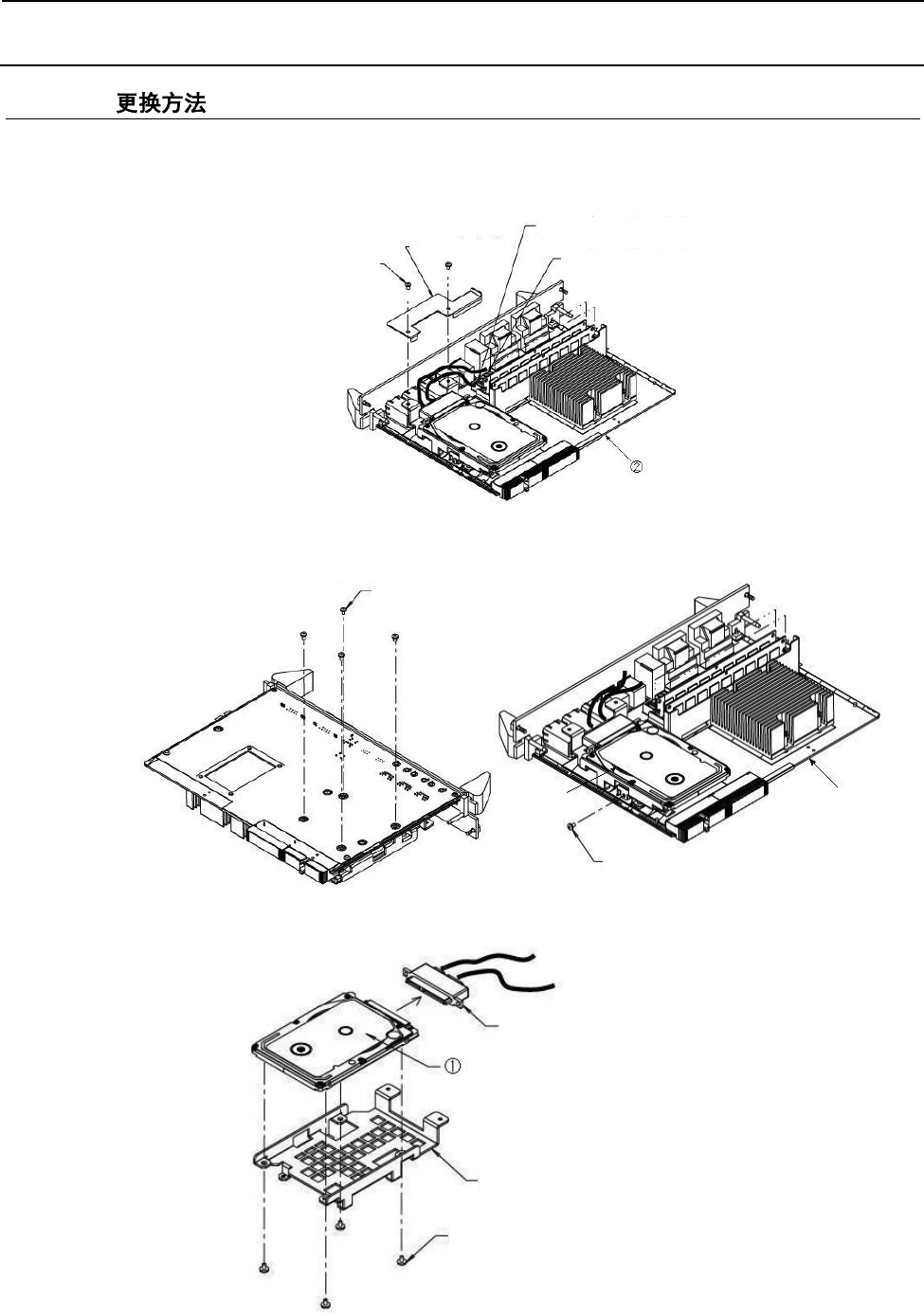 维修调整要领书 12-6 12-2-1-2 1) 请从控制装 置中拆下② CPU BOARD 。 2) 请卸下③电 缆护罩的④螺 丝(M2. 5)2个,拆下 SA T A 电缆连接 器、 DC 电缆的连接器。 3) 请拆下 CPU BOARD 背面 的④螺丝(M2 .5)4个和侧 面的④螺丝( M2.5)1个 。 4) 请拆下⑤螺丝 (M3 )4个,从⑥座板上 卸下① SS D ,再拆下⑦ S SD 电缆 。 5) 安装时,请 按照相反…