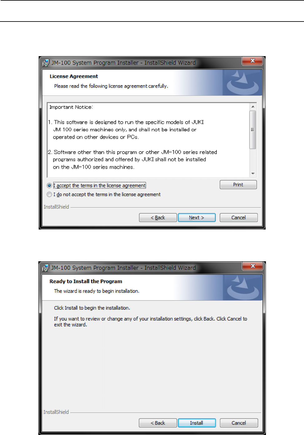 维修调整要领书 12-26 6) 显示关于使 用许可协 议的确认画面。 勾选 [I accept th e terms in the licens e agreement] ,点击 [Next] 按 钮,进到 7 ) 。 (继续前进 时需要接 受告知事项。 ) 7) 显示安装开 始前的确 认画面。 请点击 [install] 按钮进到 8 ) 。