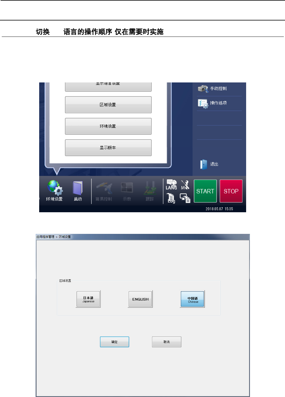 维修调整要领书 12-30 12-2-4-4 OS ( ) 切换 OS 的语言要对 C 驱动器进 行写入, 但 JM-50 中 是由机器上软 件进行 C 驱动器的更新操 作。因 此不必进行 事前的 C 驱 动器更新操 作。 1) 在系统已启 动的状态 下,选择“环境设置 ” - “区域设 置” 。 ※ 如用户 级别不是 维护员以 上,不会显示“地区 设置”菜单。 2) 选择要切换 的语言, 点击 [ 确定 ] 按钮。