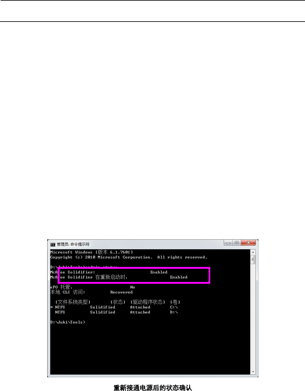 机的电源。从新接通后再次显示“McAfee Solidifie 命令提示符”,输入“sadmin status”进行再