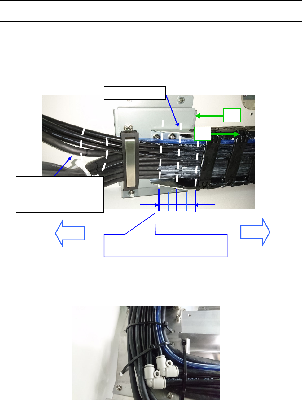 6) 调整线束,使 2 条记号的中间位置成为 Y 电缆拖链的端部(移动端部),予以固定。