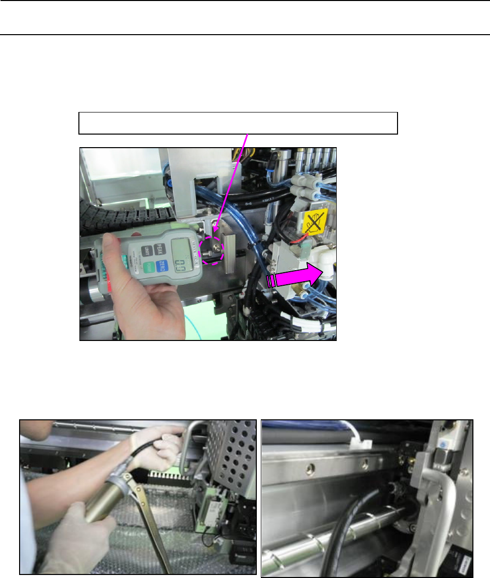 维修 调 整 要 领 书 ( 5 ) X 轴的滑动负荷测量方法 1 ) 将 HEAD_ U NIT 向左移动。 2 ) 从左按到右,测定 3 次最大值后求平均值。 3 ) 从右按到左,测定 3 次最大值后求平均值。 ( 6 )确认( 5 )之 2 )的平均值与( 5 )之 3 )的平均值之差为 5[N] 以下。 1-40