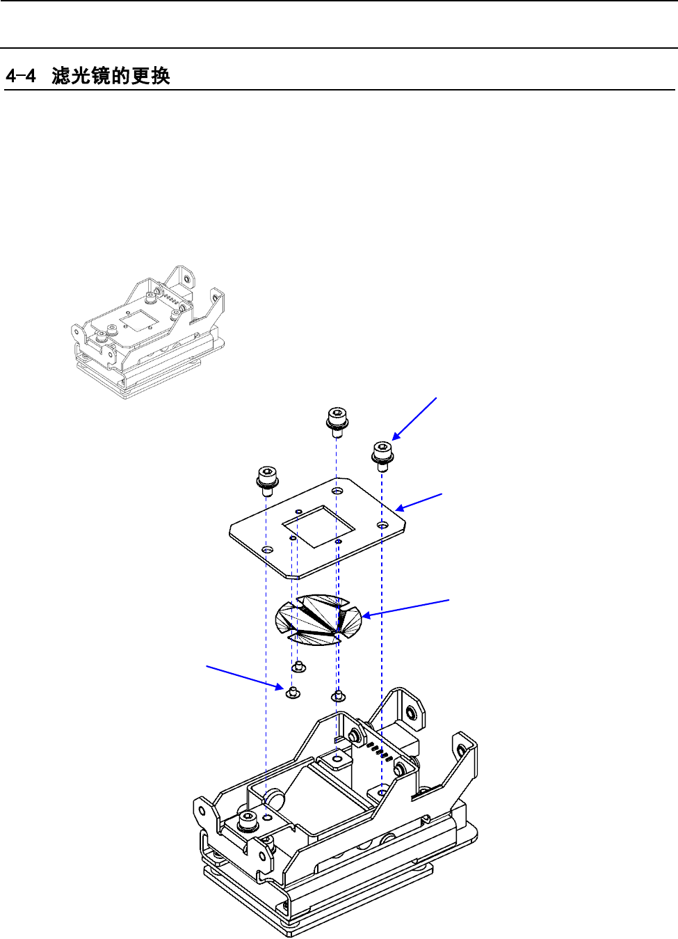 维修 调 整 要 领 书 1) 卸下照明装置。请参照第 4-1 项 [OCC 装置 件更换 ] 。 2) 卸下 OCC 同轴照明基板。 3) 卸下 OCC 角度照明基板。 4) 安装时,请按照相反的顺序进行。 5) 交换后,请参阅 4 -7[ 更换 OCC 装置后的从新调整项目 ] 。进行调整所需的输入和 MS 参数。 角度照明基板 同轴照明基板 埋头螺钉 M 3 L=10 带垫片内盆头螺钉 M3 L=6 扩散器 4-3