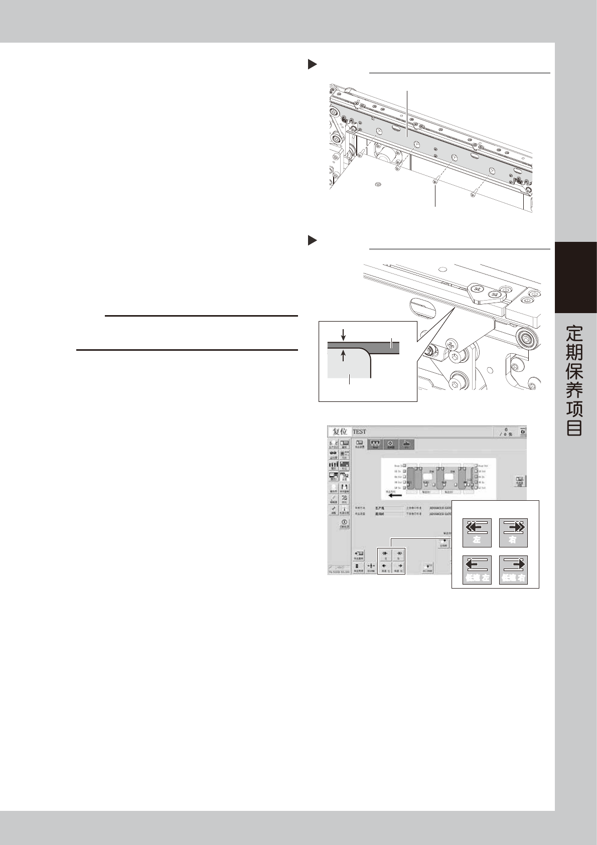 3-51 3 9 安装基板固定夹。 1. 将基板固定夹嵌入原位之后,用内六角扳手 (3) 拧紧基板固定夹的 4 处固定螺栓。 2. 取出垫在顶板上的方巾。 55351-N2-00 0 确认传送带的安装状态。 1. 确认基板固定夹顶面的位置是否在低于传送带 传送面约 0.5mm 的位置。 2. 关闭贴片机的安全机盖,解除紧急停机状态。 使用一次性换料车的机型,需将料车安装在贴 片机上。 3. 按 [ 装置 ] - “传送装置” 画面的传送…