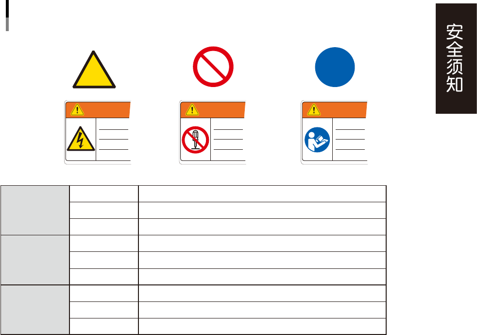 警告标贴有下列 3 种标记。标记与象形图虽然是补充说明警示语的,但其本身也具有含义。
