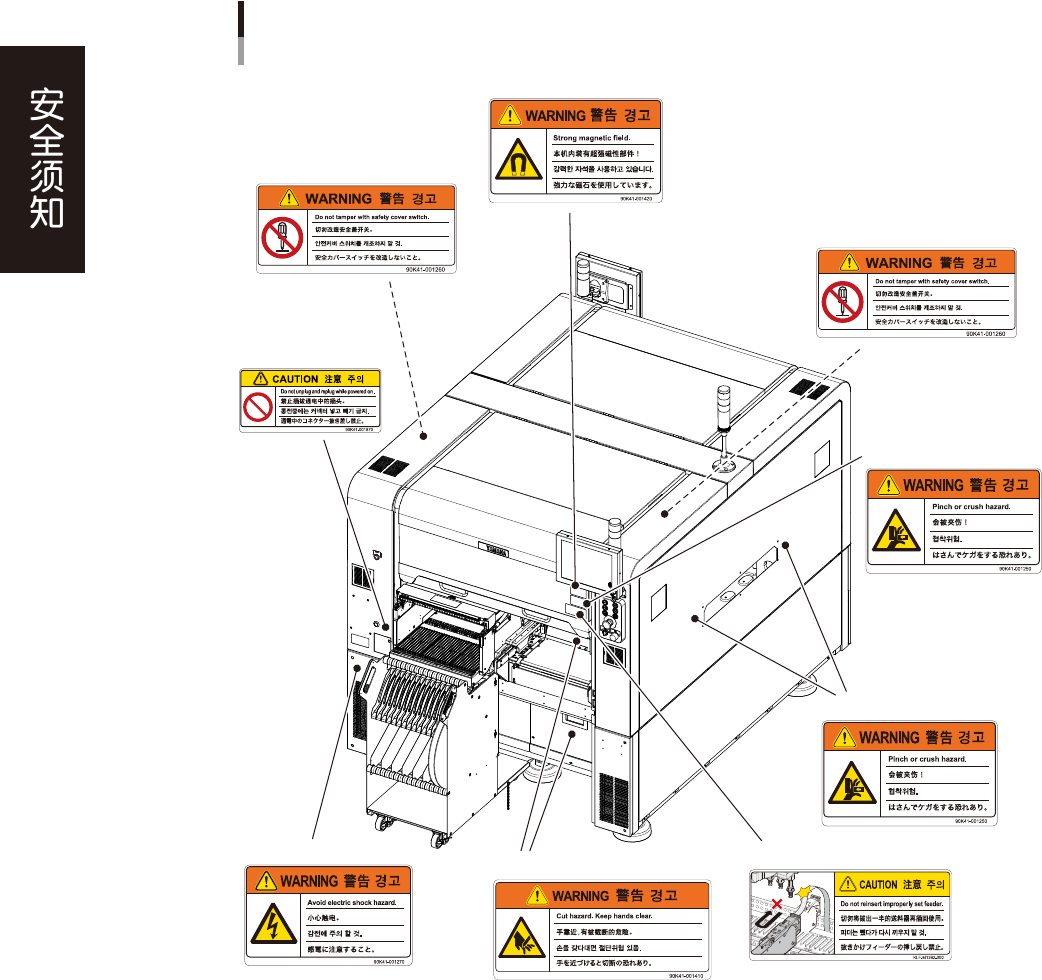 vi ■ 标贴张贴位置 警告标贴 背面 ■ 开闭机盖 (前后) ■ 开闭机盖 (前后) ■ 送料器安装部 (前后) ■ 切带器部 ■ 传送轨开口部 (前后、左右) ■ 开闭机盖内部 (前后) ■ 盖板内部 ■ 开闭机盖内部 (前后) 95201-N2-10