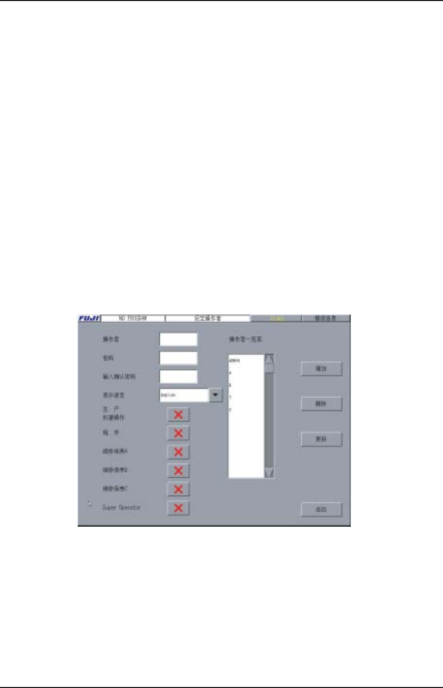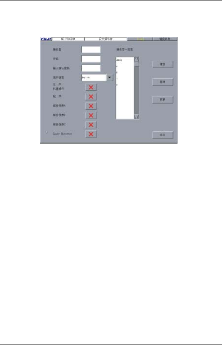 机器启动时增加的操作者名会显示在操作者清单中。有关操作者的客户化请参阅以下章