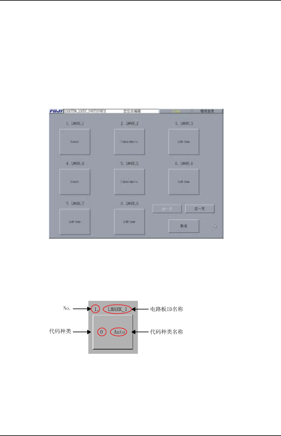 第 3 章 编辑器 第 3 部 XP-142E 系统手册 3-3-20 Edition 1.0 · [ 取消 ] 键 关 闭本 画面。 · [ 前 页 ] 键 /[ 次 页 ] 键 切换页 面。定位点数据可在 1 个画面 里 显示时,不显示 该 键画面。 3.5.2 电路板 ID 一 览表 画面 本 画面显示 现 在正在编辑的电路板 ID 一 览表 画面。 XP2S2231S · 显示编辑中的电路板 ID 。 显示电路板 ID 名、 代…