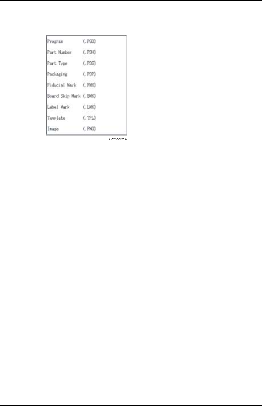 第 5 章 文件操作 第 3 部 XP-142E 系统手册 3-5-2 Edition 1.0 文件类型 显示机器内的数据文件夹和软驱。 项目说明 Local 机器的硬盘。 FDD 软盘驱动器 Program (.PGO) 生产程序文件 Part Number ( .PDH) Part Numbe r 文件 Part T ype (.PDS) Part T ype 文件 Package (.PDP) Packaging 文件 Fiduc…