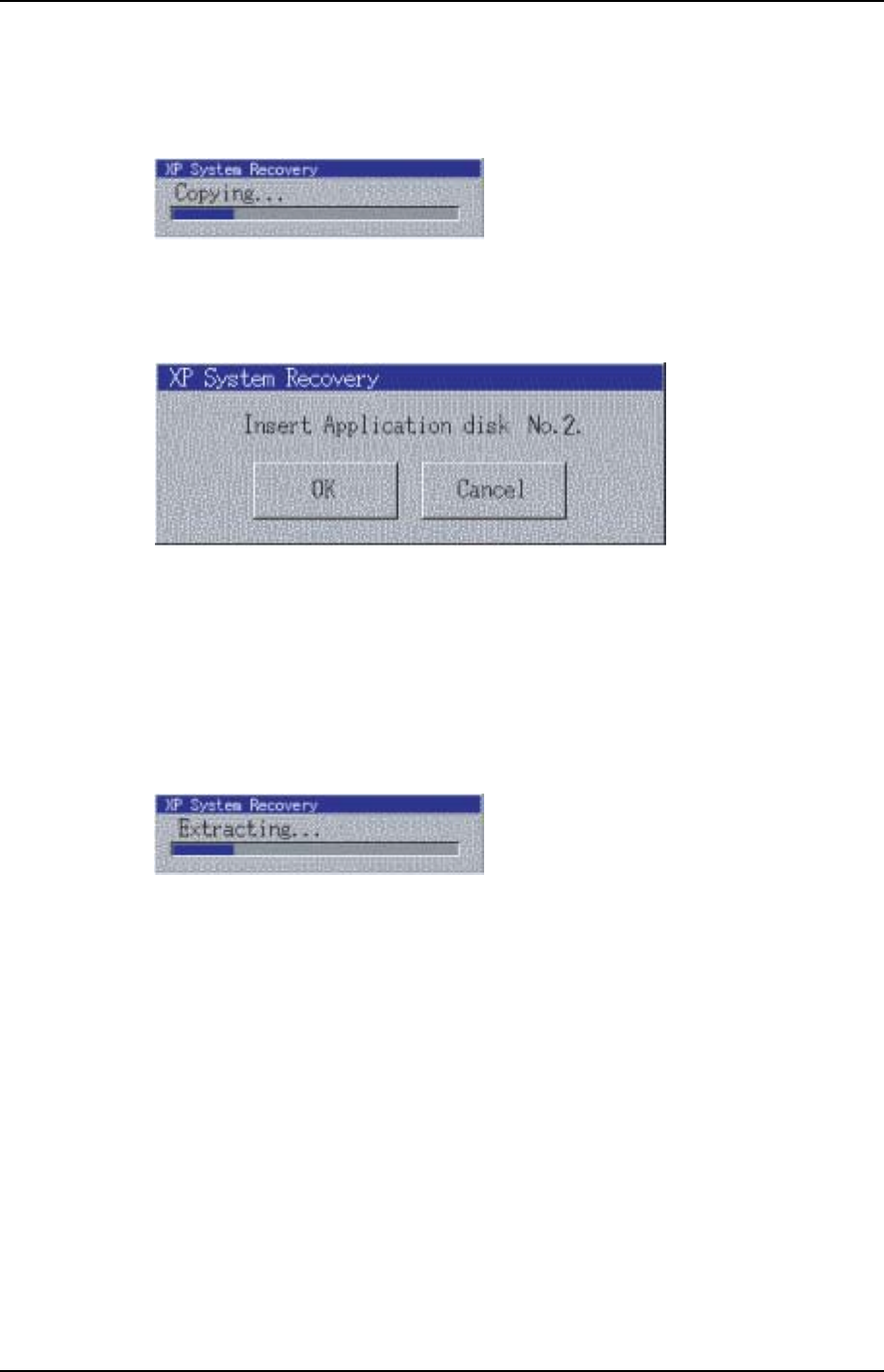 第 8 部第 3 章 用复位盘进行系统复位 Edition 1.0 8-3-5 XP-142E 系统手册 4. 单击 [OK] 键后,显示请 再次 插入第 1 张 应用程序盘的对话 框 。 通过这个 对话 框 , 插入正 确 的磁盘,按下 [OK] 键后,显示进 展 对话 框 ,开始复制文件。 XP2S2411 5. 在第 1 张 应用盘中的文件 被 复制完后, 将显示要求用户插入第 2 张 应用盘的 对话 框 。 XP2S2412 6…