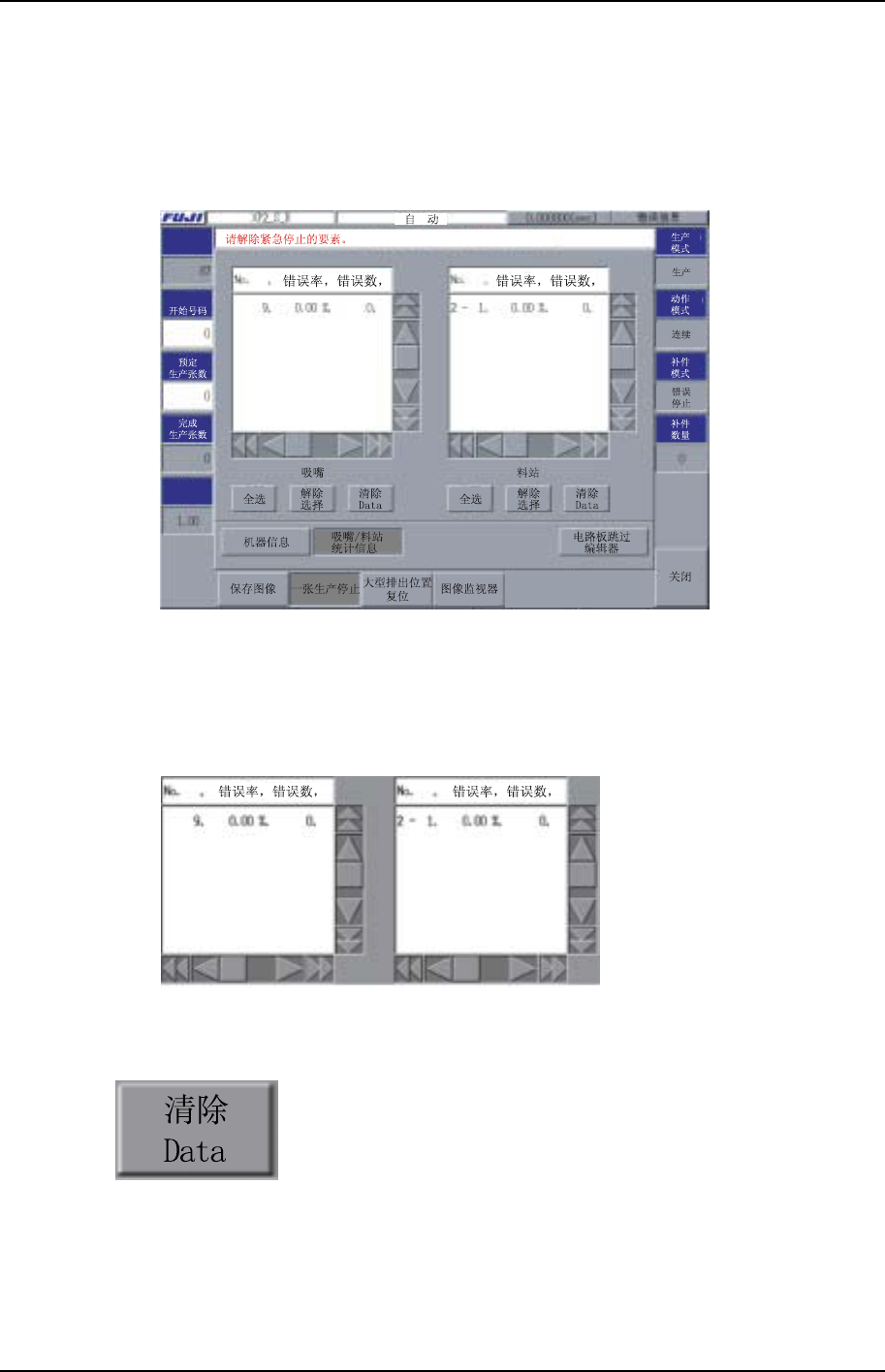 第 2 部 第 1 章 基本操作 Edition1.0 2-1-25 XP-142E 系统手册 1.1 1.3 吸嘴 站 的统 计 信息 通过 前 述 动作 条 件 设 定中的统 计 信息 设 定可显示吸嘴 / 料 站 的 错误 状 况 的 数据 。 机器自 动运转 过 程中 也 可确认 这 个 数据 。 要在机器自动运转 过 程中 阅 读 数据 ,请从 [ 自动 ] 画面中选 择 [ 吸嘴 / 料 站 统 计 信息 ] 。 XP2S2…