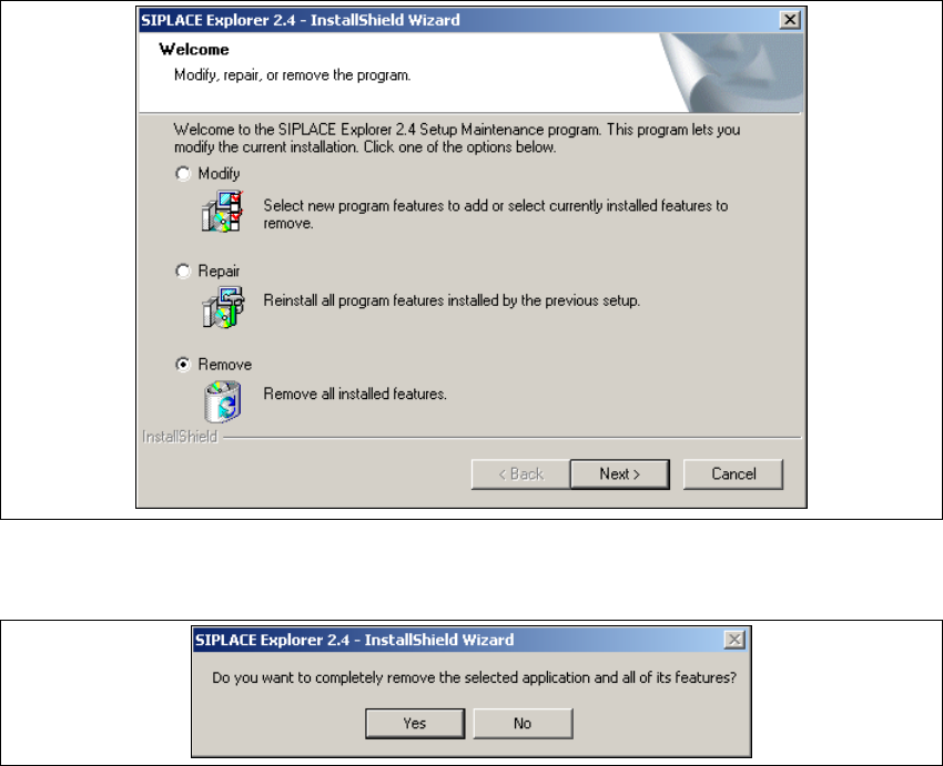 Installation and Configuration Guide SIPLACE Explorer 5 Uninstallation Edition 06/2008 EN 5.4 Remove 109 5.4 Remove 5 Fig. 5 - 9 SIPLACE Explorer 2.4 - install shield wizard → Click on Remove and then on Next to continue…