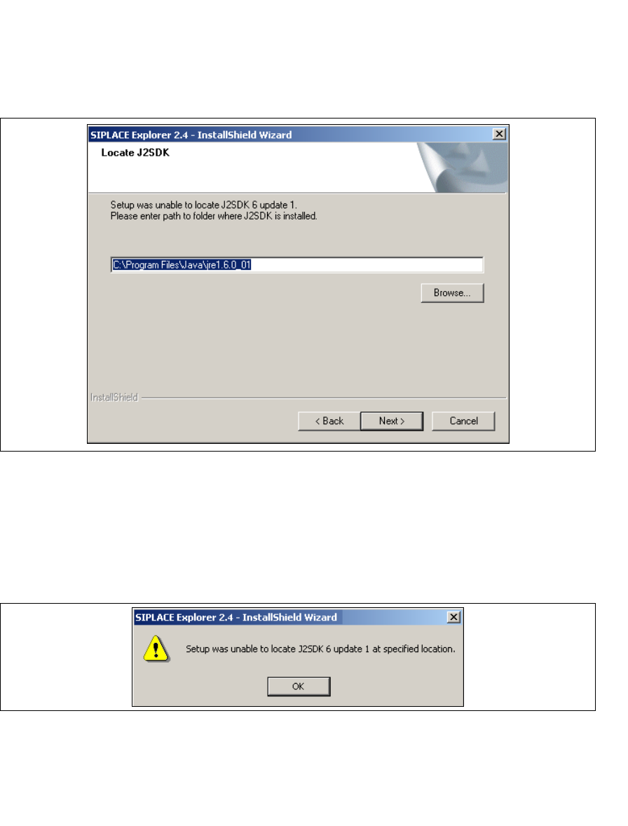 Fig. 3 - 6 SIPLACE Explorer setup - unable to locate J2SE