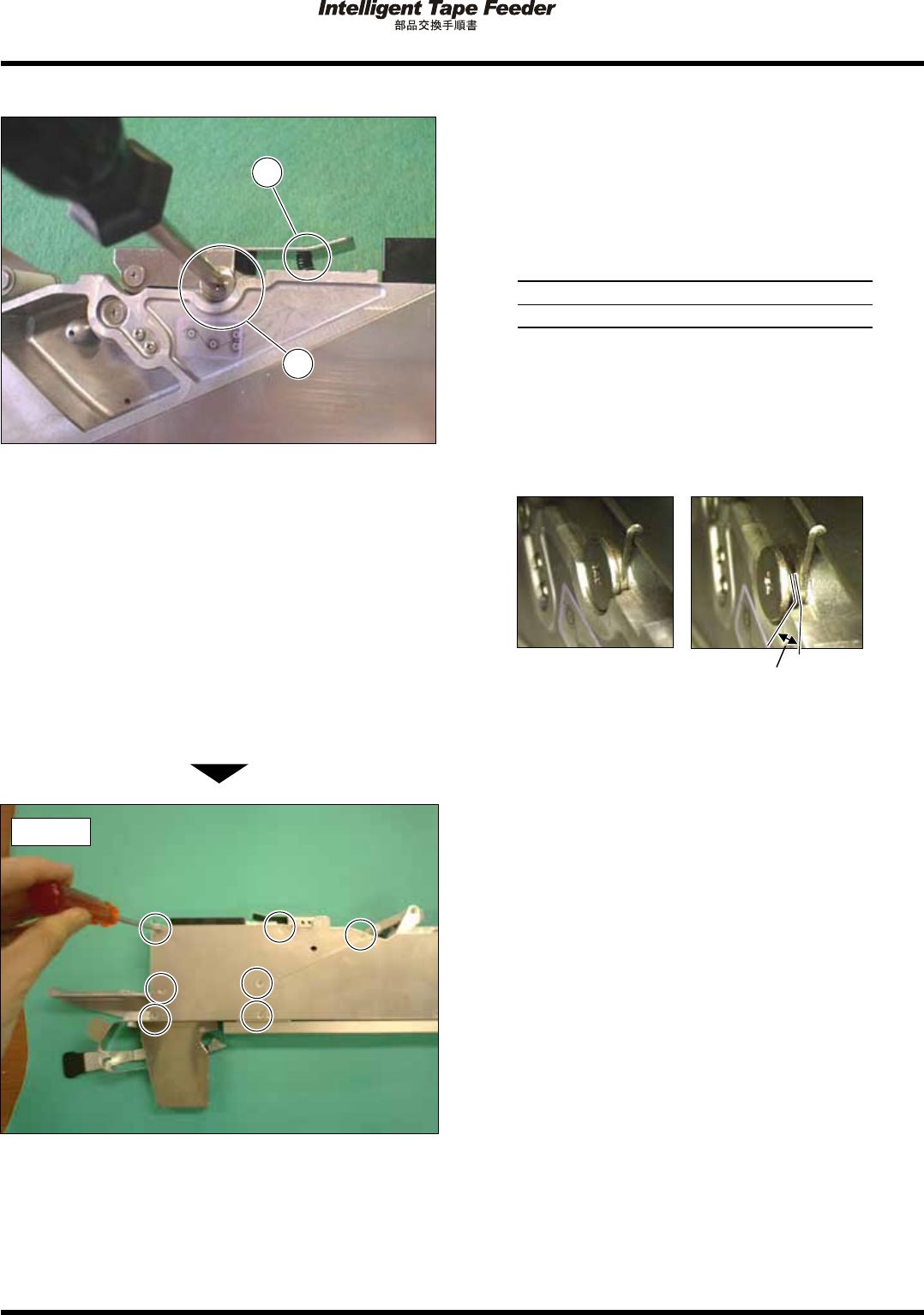 2.11 下側引込みギア Pa ge 2- 41 6. コムの先端と歯車の円との位置関係を確 認する。 ∗ 目視で歯溝の円からコ ムの先端エッ ジが出て いないことを確認して ください。 ∗ コムをギア溝部に軽く 押し当てた状 態で、ビ スを固定してください 。 コムの爪先がギア溝部 から離れてい るとコム の先端エッジが歯溝の 円から出てし まい、 トッ プテープの引き込みが 正しく行われ ないこと があります。 ( 良い例 ) IN…