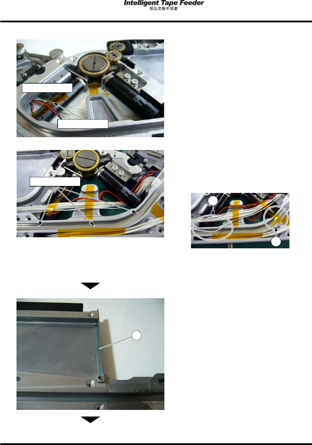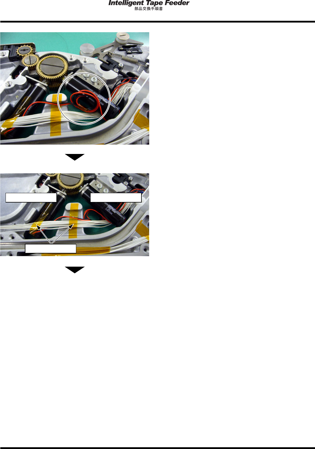 1.11 トップテ ープ引き込み モータ Pa ge 1- 53 17. L 側 /R 側のモータ線を R 側モータの左側 でまとめ、 カプトンテープで R 側モータ に固定する。 ∗ 配線固定時はカ バー取り付け 面より上にな ら ないように固定 してください 。 ( カバーを取り付け た際、 挟み込み断線、 ショー トの原因になり ます。 ) ∗ カプトンテープ 、配線、配線 カバーがワー ク 走路 ( 溝 ) やフレーム上面、 配…