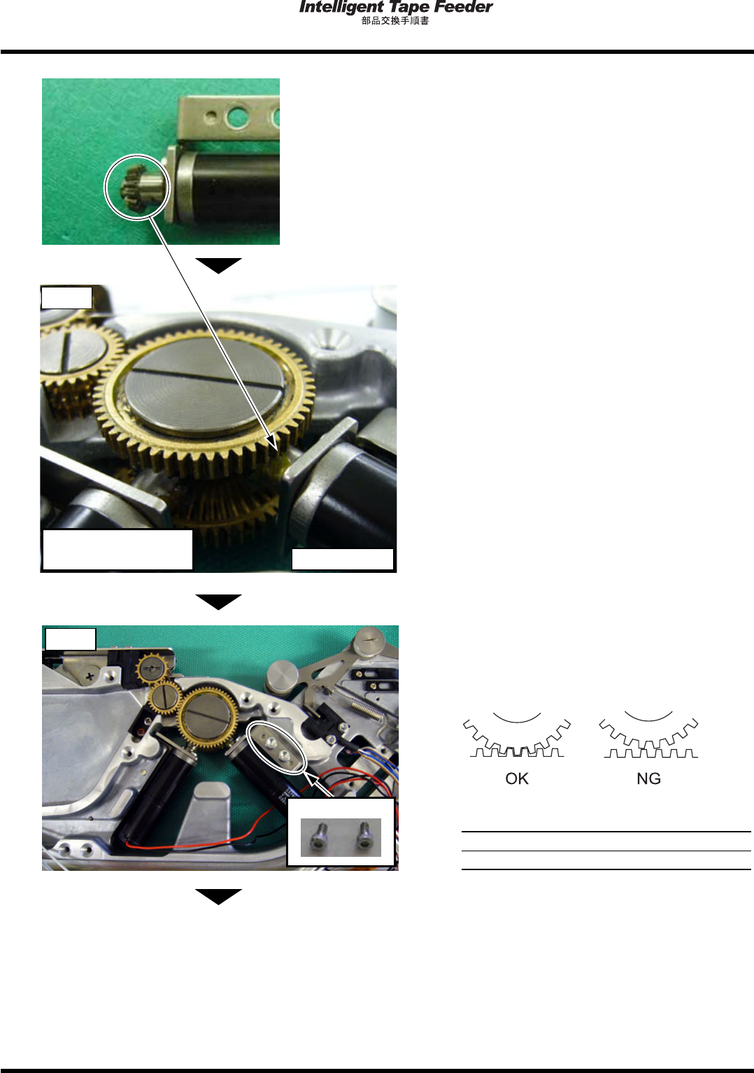 1.11 トップテ ープ引き込み モータ Pa ge 1- 48 取り付け 1. 交換するモータ (L 側 ) のギア面に薄く グリスを塗る。 ∗ グリスは下記を 使用してくだ さい。 MP グリス 2S ( 品番 : N510006423 AA) 2. フレーム L 側の面を上に向け、 モータ取 り付け面部の位置合わせ用インロー (2 か所 ) でモータをセットする。 3. ギアの噛み合わせがずれないよう注意し ながら固定ボルトを…