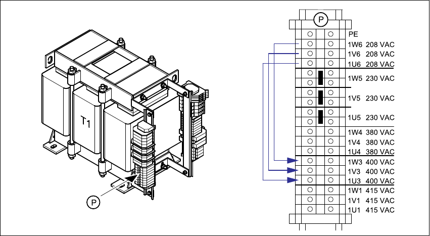 3.6.4 Converting the three-phase transformer T1 from 3 x 208 VAC to 3 x 400 VAC