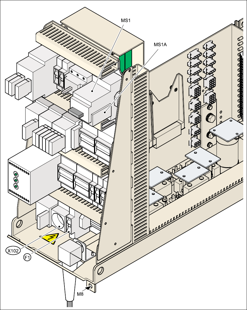 3 Stromversorgung am Automaten HF umrüsten Montageanleitung Stromversorgung umrüsten 3.6 Stromversorgung von 3 x 208 V~ auf 3 x 400 V ~ umrüsten Ausgabe 12/2013 34 Abb. 3 - 14 Stromversorgung Frontansicht MS1 Motorschutz…