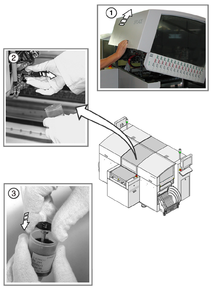 SIPLACE D1 / D2 5 每月保養 2008 年 8 月中文版 2.6 保養計劃 27 5 進行每月一次的保養時,需要使 用下列工具、設備和耗材: 5 - 實驗室手套 - 無棉絮抹布 - 鏡頭抹布 - 棉棒 - SIPLACE 清潔紙巾 - 無水乙醇 - 乾淨的段位器光柵盤 組 - 乾淨的、微微潤滑的 閥門推桿組。 - 必要時,請使用避免 取置頭碰撞的開關 5 更換段位器光柵盤及閥門推桿 5 O 使用 "Single…