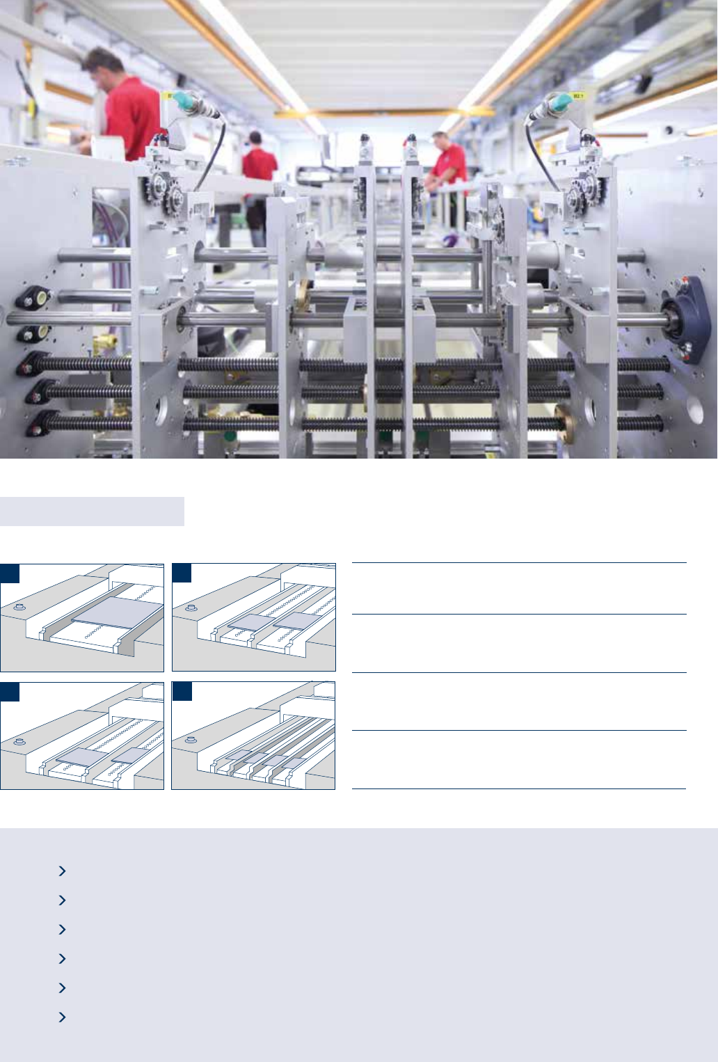 7 1. Single lane transport one adjustable chain 2. Dual lane transport two adjustable chains, synchronous/ asynchronous transport speed 3. Multi-track transport three adjustable chains, synchronous/ asynchronous transpor…
