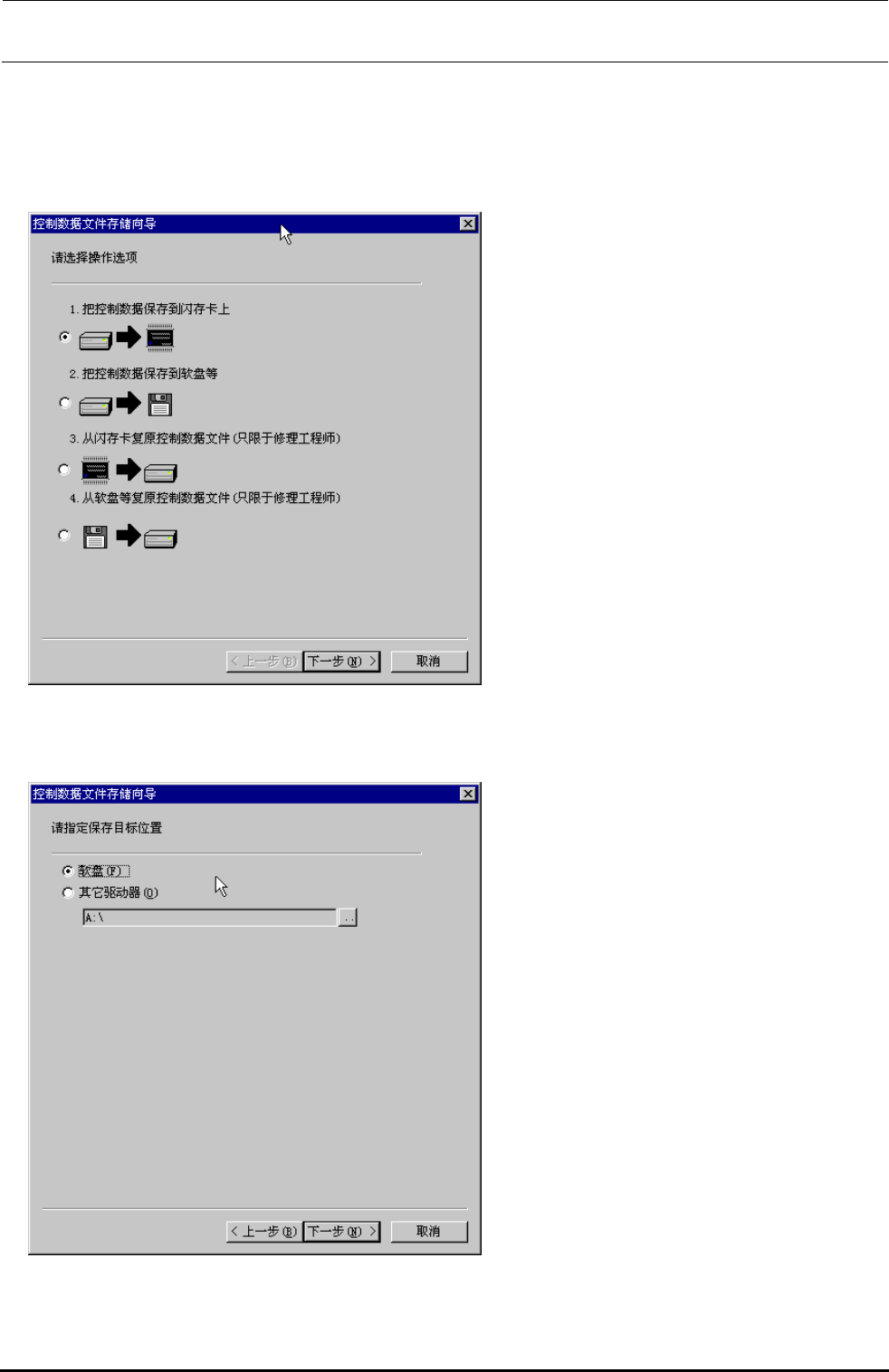 ② 控制数据文件存储想到被显示出来。这时、请选择「2.把控制数据保存到软盘等。」、然后选择下一步