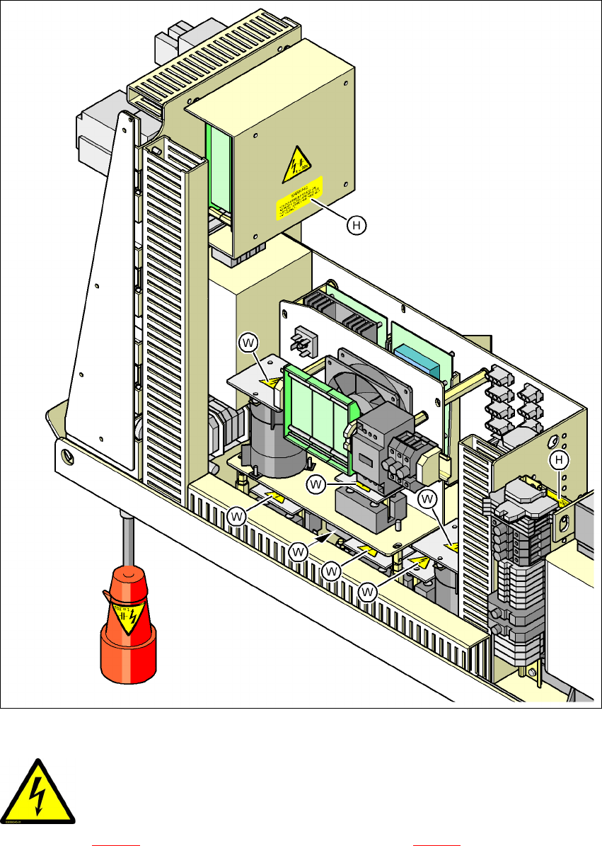 Fig. 2.2 - 10 Warning label W and information plate H on the power supply unit
