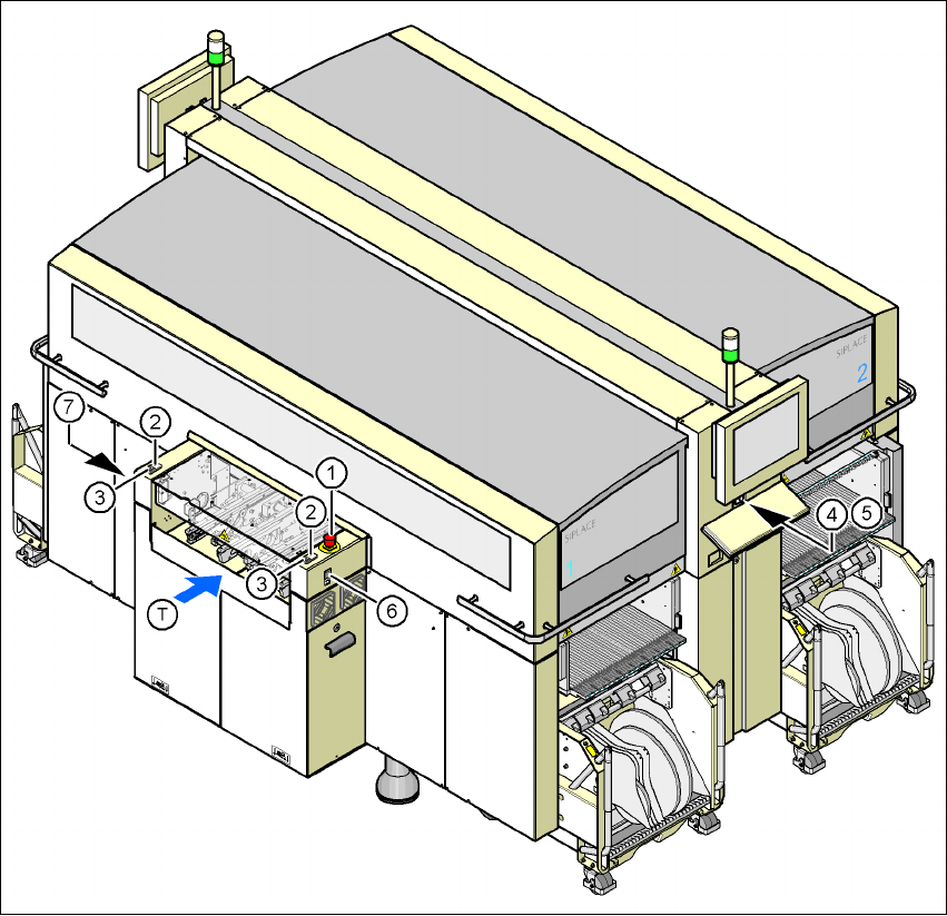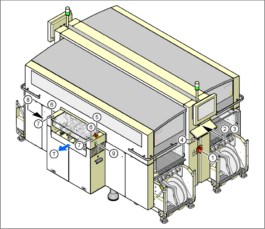 User manual SIPLAC E X-Series 2 Operational safety Software Vers ion SR.601.xx 11/ 2005 US Ed ition 2.6 Safety equipment 63 2.6.2 Switc hes and buttons on the placem ent machine 2.6.2.1 Position of swit ches and buttons …