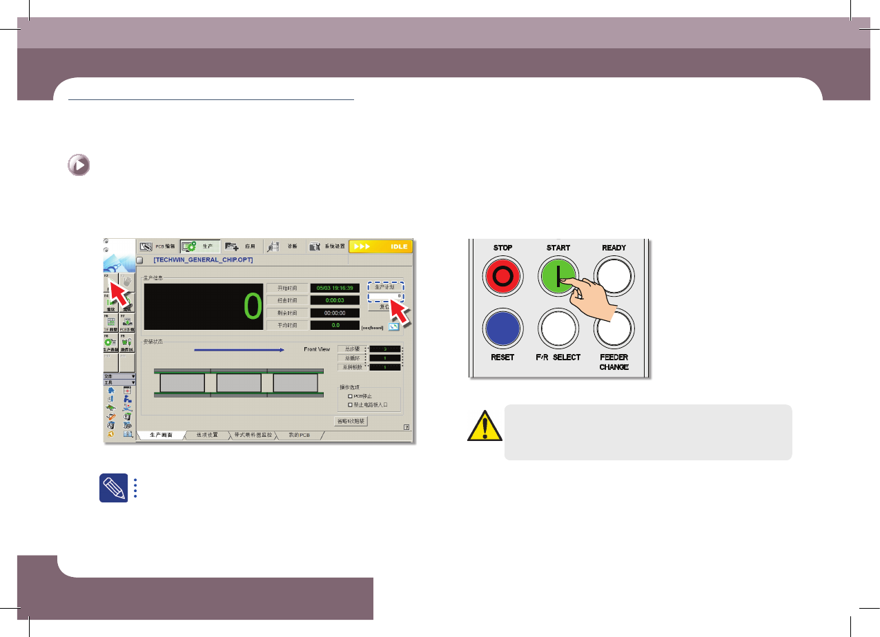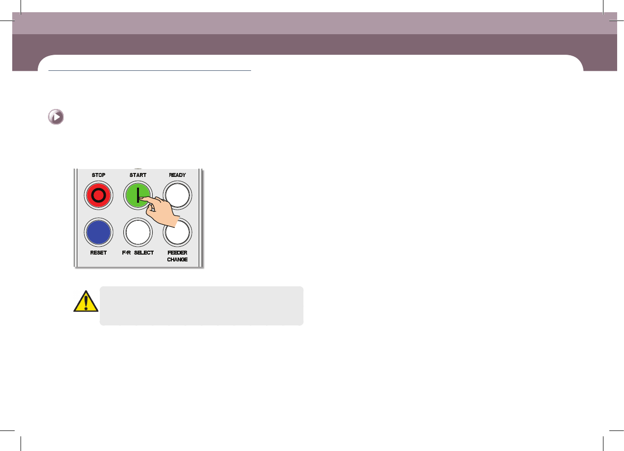 Operation Handbook 3-1 9 Chap ter 3 本 Chapter 主要介绍生产作业顺序 生产 生产 > 开始 作业 ( 自 动生产 ) 生产 2. 开 始 作 业( 自 动 生 产 ) Step 1. 按 操作面板的上的 ' S TA R T ' 按钮 ㆍ 按< ST ART >按钮恢复生产。 警 告 必须确认设备周围是否有工作人员后开始生产