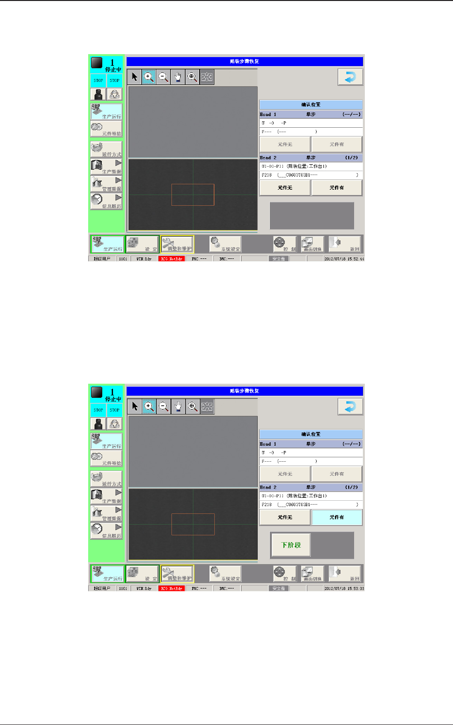 1OM-1732 3-5-6 5.4 用贴装恢复重新开始生产 使用吸取前吸嘴确认功能时,若在吸取元件之前检测出吸嘴顶端存在异物或 元件,就显示 “ 吸取前吸嘴确认异常 ” 界面,进入贴装恢复操作可能状态。 Fig.1C5-7 Procedure (1) 按 [ 返回 ] 按钮。 ( 显示 “ 贴装步骤恢复 ” 界面。) Fig.1C5-8 1208-002 5.4 用贴装恢复重新开始生产