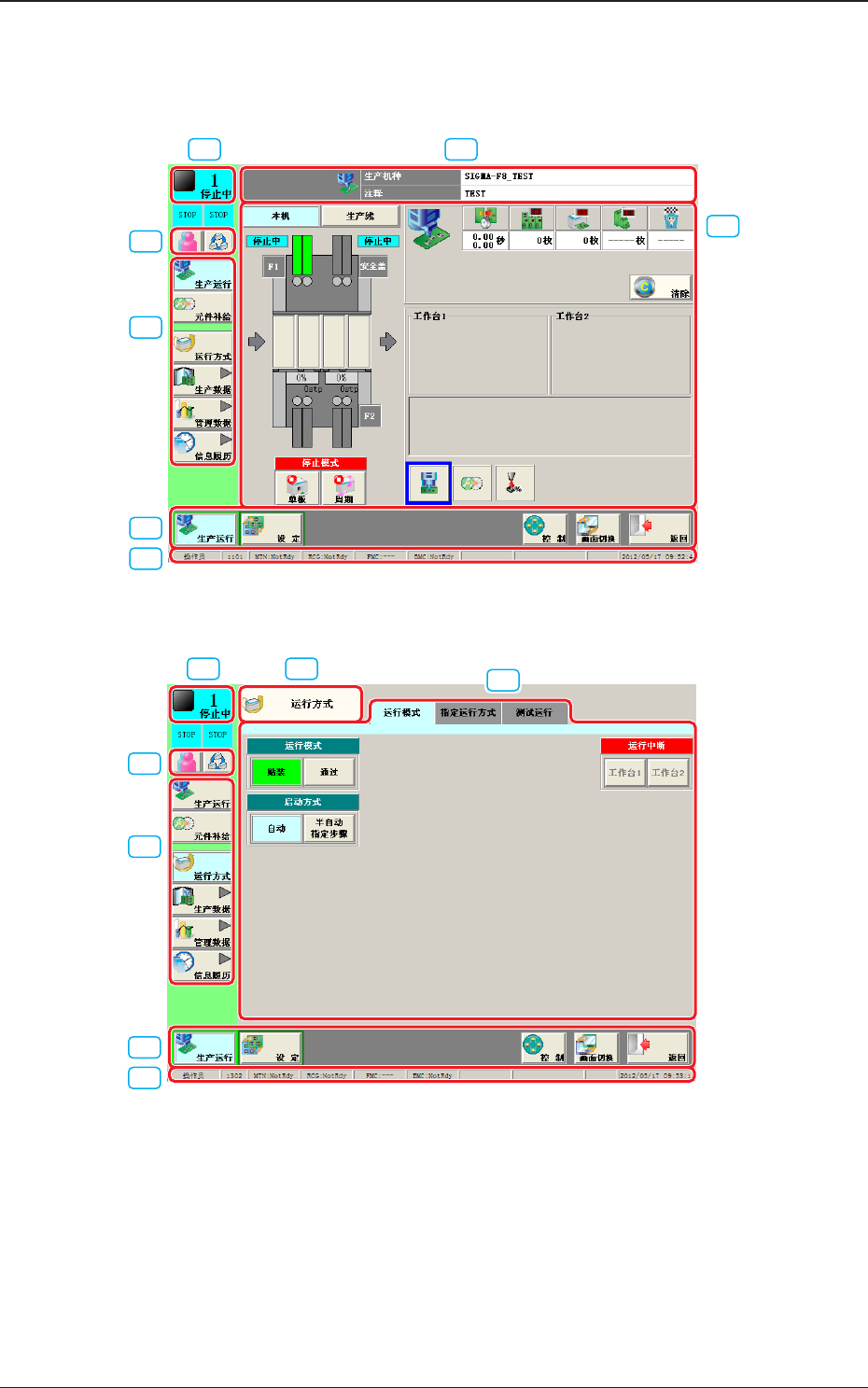 1OM-1732 2-2-1 2. 操作界面 基本操作界面构成如下 : [1] [2] [3] [4] [5] [6] [8] Fig.1B2-1 “ 生产运行 ” 界面 [1] [2] [3] [4] [5] [7] [8] Fig.1B2-2 “ 运行方式 ” 界面 1208-002 2.操作界面