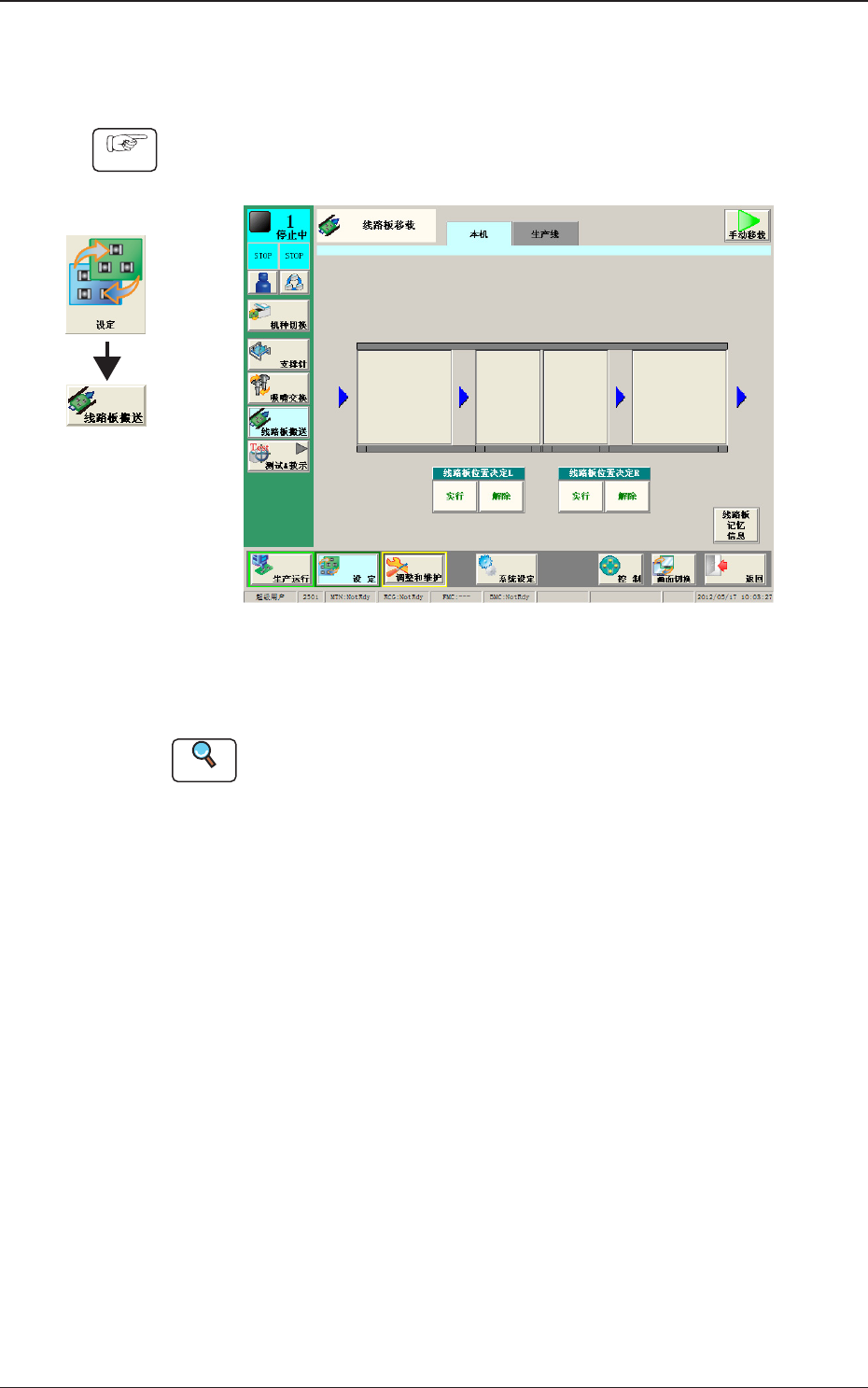 1OM-1732 3-2-13 1208-002 2.3 生产机种的切换 2.3.5 线路板搬运和位置定位状态的确认 在 “ 设定 ” 菜单的 “ 线路板搬送 ” 界面中确认线路板搬运和位置定位状态。 Procedure (1) 随着 “ 界面展开 ” ,显示 “ 线路板移载 ” 界面。 Fig.1C2-9 (2) 从前工序搬入线路板。 Reference 手动搬运线路板时, 请参照 “ 第三章4.1.1手动贴装线路…