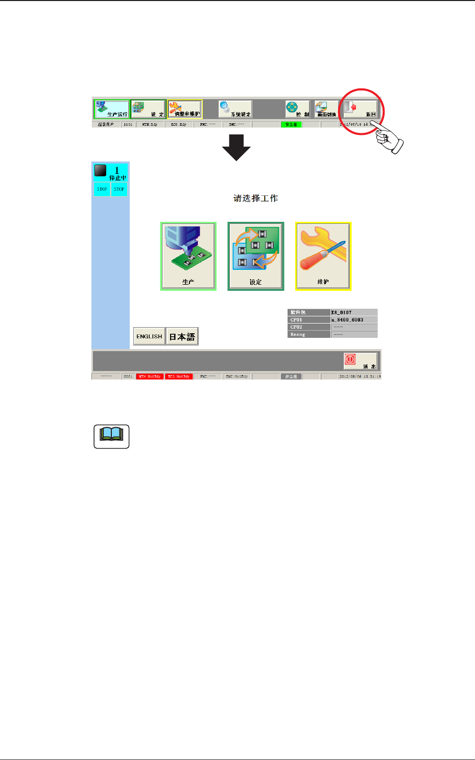 1OM-1732 3-5-10 1208-002 5.5 生产运行的结束 5.5.2 退出登录 结束操作界面时,按共通菜单的 [ 返回 ] 按钮。  结束操作界面返回到 “ 初始 ” 界面。 Fig.1C5-13 Note  (a) 显示有 “ 线路板程序 ” 编辑界面等各种编辑界面时,在按 [ 返回 ] 按 钮之前,请根据相应操作步骤结束各种编辑界面。 (b) 退出登录后,切断装置电源时,请按 [ 退出 ] 按钮。  详细…