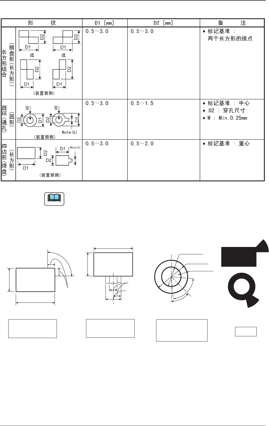 1OM-1732 4-3-2 Table 1D3-2 Note (a) 对于基准图形,标记尺寸误差须在 ±10% 以内。 (b) 从通孔以及焊盘分出来的配线方向以 45 ° 为一个单位,只有一个。 (2) 从焊盘以及通孔分出来的配线规格 与配线的连接范围 焊盘45° 单位配线位置范围 焊盘90° 单位配线位置范围 (装置前侧) (装置前侧) 短边的1/3 0.5~2.0 0.5~3.0 与配线的 连接范围 (装置前侧) 单位:mm 配线…