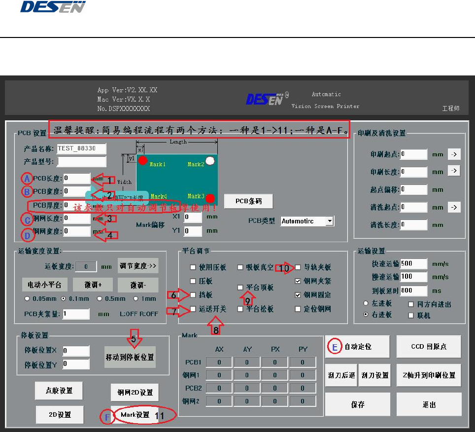深圳德森精密设备有限公司 第四章 操作系统说明 27 (图 6) Mark 点设置流程 如上 图做 单 照程 序流 程( 手 动模 式) 1->A->B ->C,2->A->B ->C, 做双 照 时加上 3->A->B->C,4 ->A->B->C 。最后点 OK 保存 Mark 点数据! 4.2.4 开始 / 停止 / 生产 做好工程后请点“开始/停止/生产/F…
